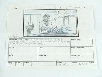 Original hand drawn storyboards are extremely rare, since once the artist finishes them, they are immediately copied so that the sequences can go to various departments for them to work on their specific areas of expertise. This is an original pencil drawn storyboard page from Richard Edlund's award winning legendary special effects "Boss Studios" for the 1987 live-action feature based on the classic cartoon series "Masters of the Universe". This page is on a Boss Films Special Effects Form Page, with the scene drawn, and descriptions. Specifically, this is the scene where Detective Lubic (James Tolkan) is in Julie's (Courteney Cox) kitchen and presses the red button on the Cosmic Key causing strange light patterns to flicker in the air (thus the effect they needed to create). A beautifully realized page suitable for framing. (Page is 11"x9"). Comes with a COA.