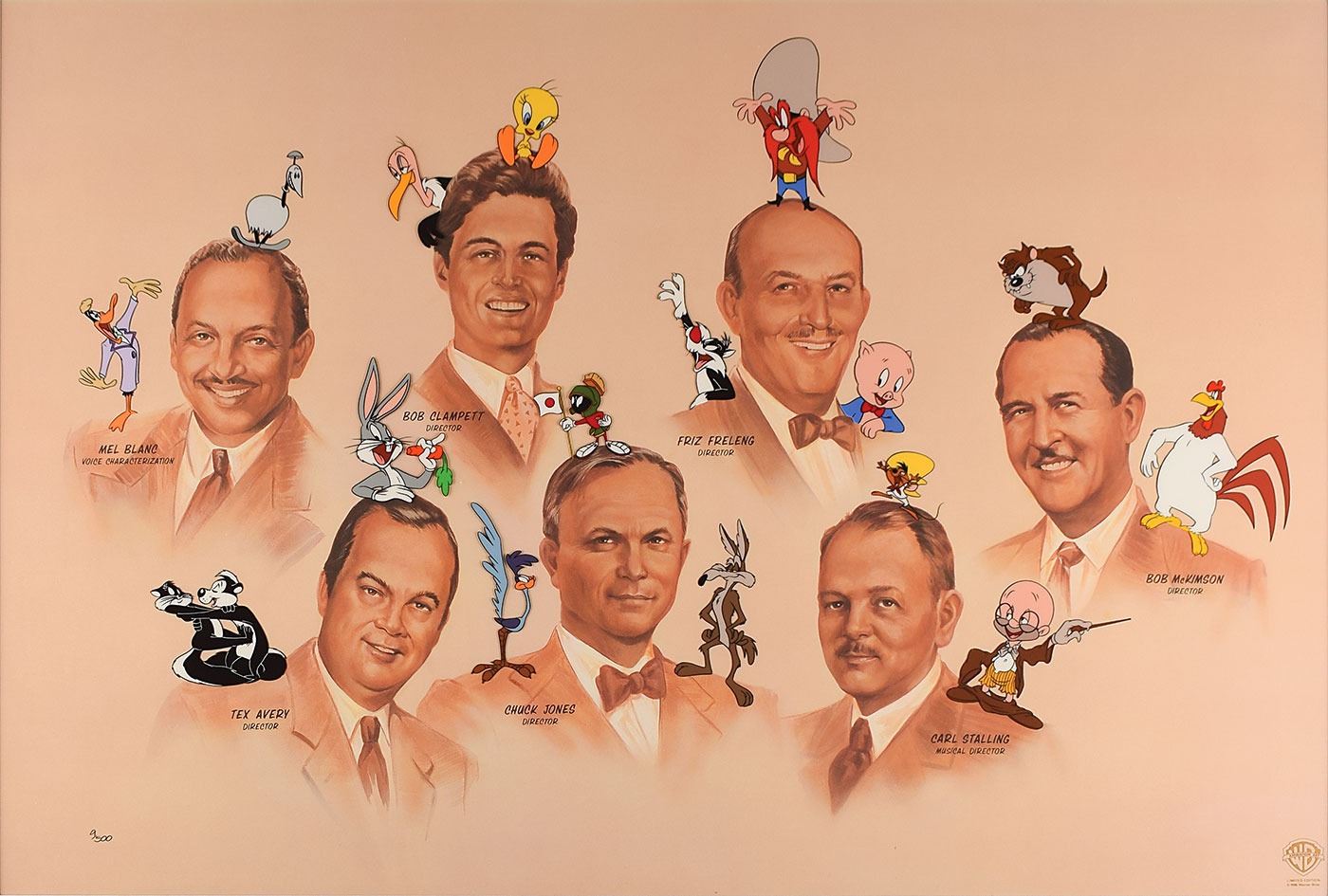 (Warner Brothers Studios, 1996) Attractive limited edition cel entitled 'Masters of Animation,' numbered 9/500, featuring 17 classic Looney Tunes characters alongside artistic portraits of seven of the most influential men in animation—Mel Blanc, Tex Avery, Bob Clampett, Chuck Jones, Friz Freleng, Carl Stalling, and Bob McKimson. The printed image of the men features a beautifully hand-painted cel overlay that features the following cartoon stars: Bugs Bunny, Do-Do, Penelope Pussycat, Pepé Le Pew, Bugs Bunny, Beaky Buzzard, Tweety Bird, Marvin Martian, Beep Beep the Road Runner, Sylvester, Wile E. Coyote, Yosemite Same, Porky Pig, Speedy Gonzales, Elmer Fudd, the Tasmanian Devil, and Foghorn Leghorn. Double-matted and framed to an overall size of 40.25 x 30. The piece has the Warner Bros. seal to lower right. In fine condition. The art for this sought-after cel was originally conceptualized and designed by Ruth Clampett, Director of Creative Design for Warner Bros. Worldwide Retail, as a mural for the Flagship Studio Store in Manhattan. A spectacular offering that was an immediate sell-out when it was released some 23 years ago.