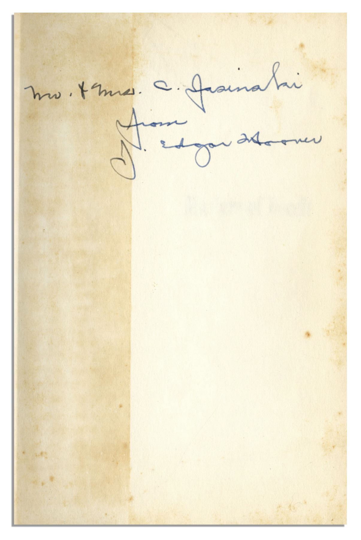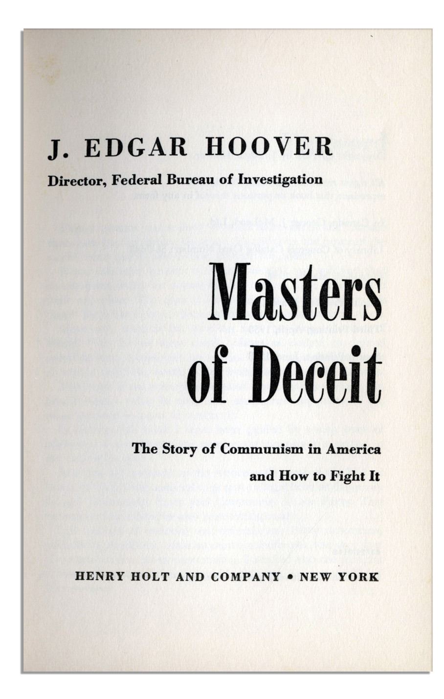 'Masters of Deceit / The Story of Communism in America and How to Fight It'' signed by Director of the FBI, J. Edgar Hoover. Published by Henry Holt & Co.: New York: 1958. The front free endpaper is inscribed ''Mr. & Mrs. C. Jasinaki / from / J. Edgar Hoover''. Runs 374pp. and measures 5.75'' x 8.5''. Bound in red and black cloth boards with gilt lettering. The unclipped dustjacket is illustrated with a blood spatter, and bears Hoover's photo portrait to the rear cover. Foxing and significant toning to leaves, especially at endpapers, else near fine. Block of toning to signature page. In good plus condition.