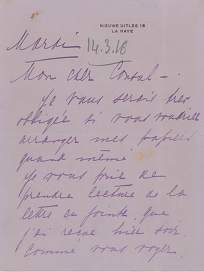 ALS in French, three pages on two adjoining sheets, 5.75 x 7.5, Nieuwe Uitleg 16, La Haye letterhead, annotated in pencil, March 14, 1916. Mata Hari writes to "Mon Cher Consul." In full (translated): "I would be very grateful if you could organize my papers anyway. Please read the letter attached that I received last night as you can see. I could still see my friend [male] and have the costume made that I need to dance Mrs. Bangeville's minuet. Also, please have the letter sent to Jean Le Franc whom I fear wounded or dead and who loved me a lot. I did not receive any news from him for six weeks. And "last not least" [in English in the text] here is the novel. Kind regards with all my thanks in return." In fine condition, with a few small stains to the first page.