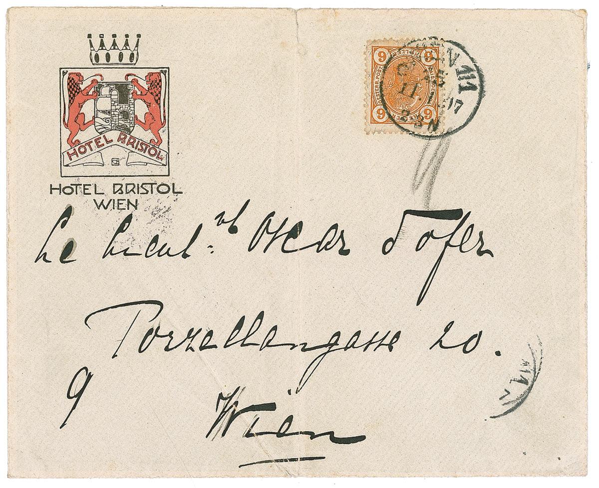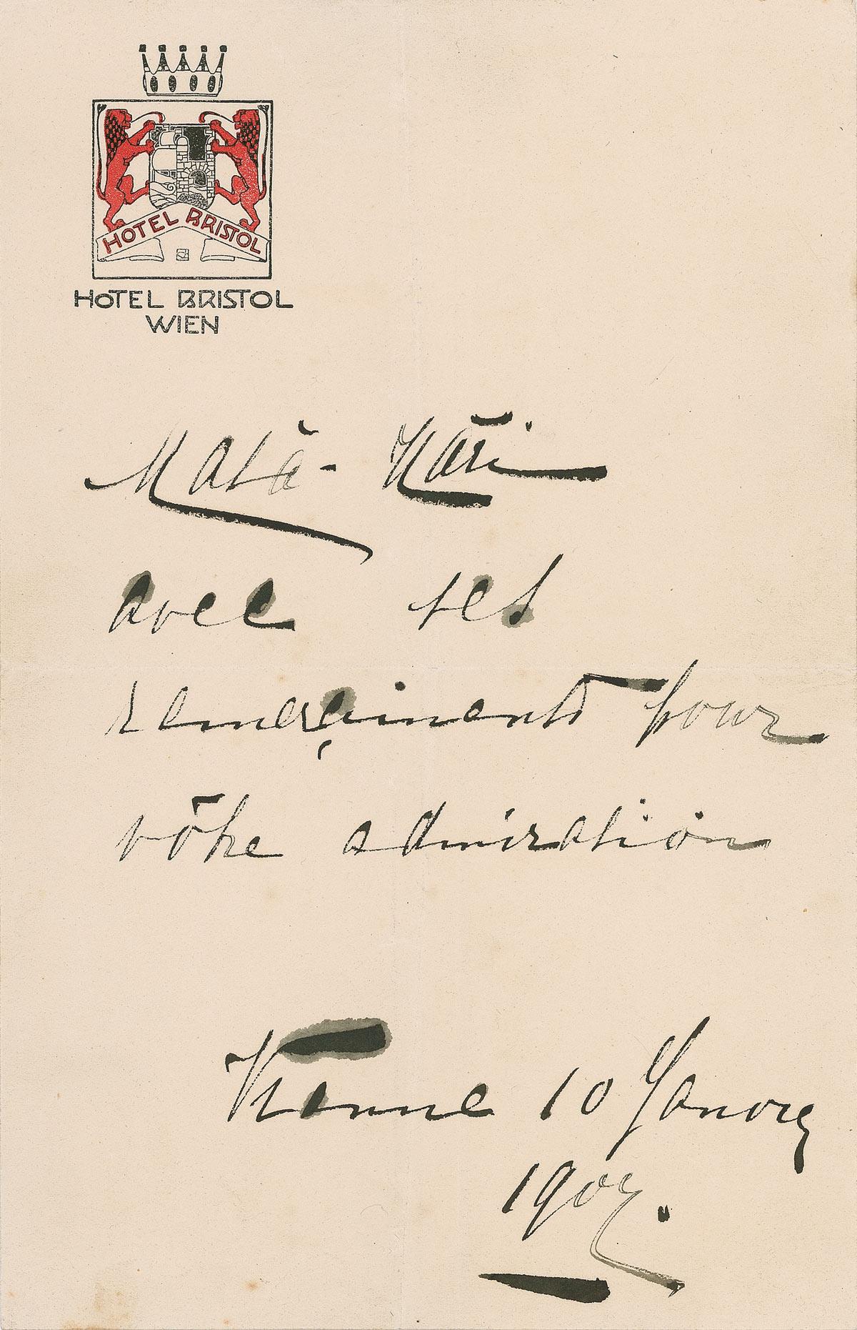 Bold ink signature and sentiment, in French, dated January 10, 1907, on an off-white 5.5 x 8.75 sheet of Hotel Bristol stationery. Accompanied by the original mailing envelope, addressed in Mata Hari’s hand to Lieutenant Oscar Tofer. Intersecting folds (several extra vertical folds to center), and pooling of ink to several letters, otherwise fine condition.
