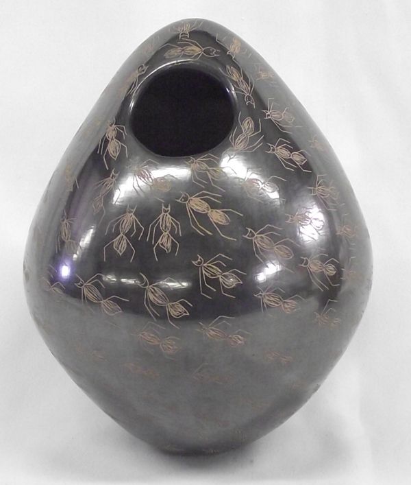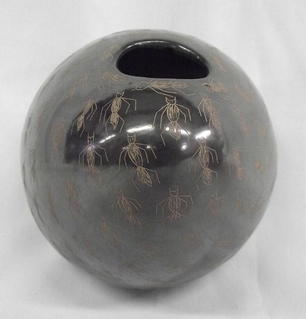 Mata Ortiz Ant Jar - Irving Camacho. The ants are marching right into the hole in this unusual design pottery from Mata Ortiz, MX. Burnished black background with ants etched into the black and revealing a light tan color. It measures 6'' x 8'' and is signed Irving Camacho on the bottom.