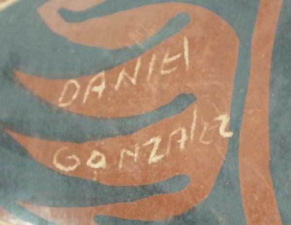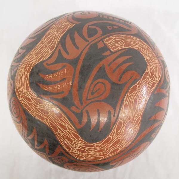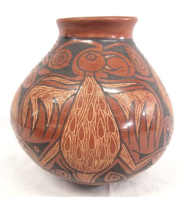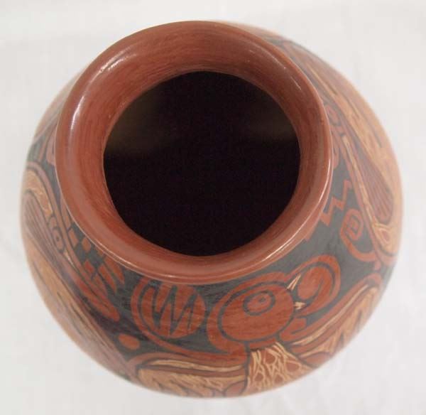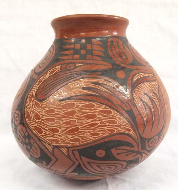 Mata Ortiz Polychrome Avanyu Jar by Daniel Gonzalez, measures 6.5'' x 6'', features birds and an Avanyu (Sea Serpent), busy jar indicative of Daniel's work