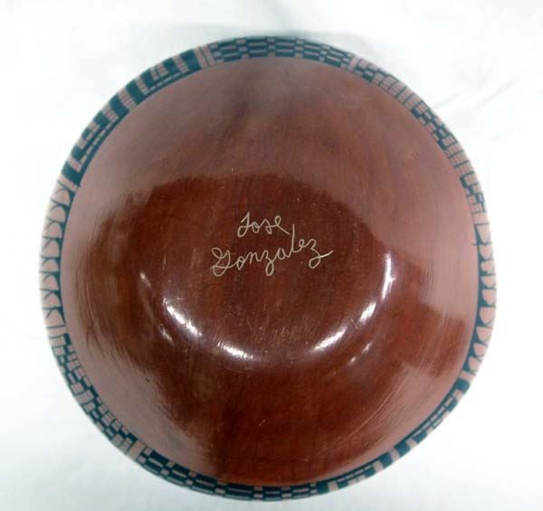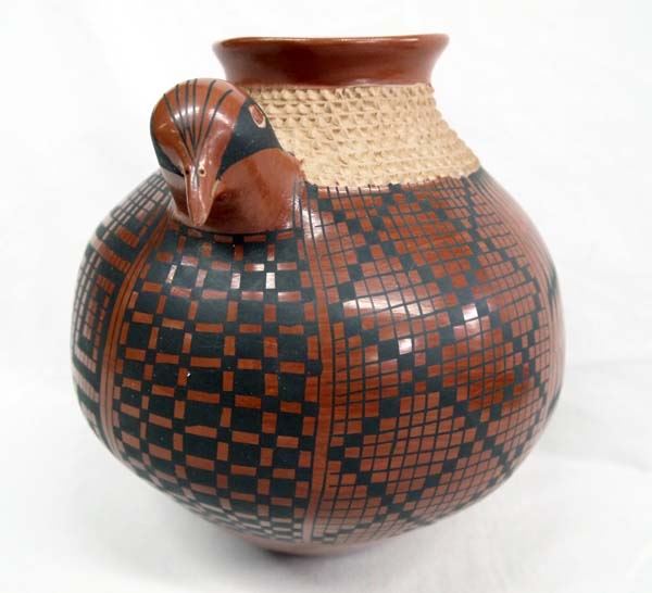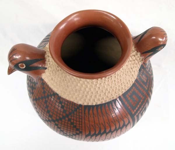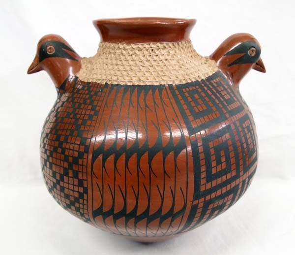 Mata Ortiz Bird Effigy Jar by Jose Gonzalez, double headed, textured neck, eye dazzler and stylized feather designs, signed on bottom by artist, measures 9''H x 9.5''W