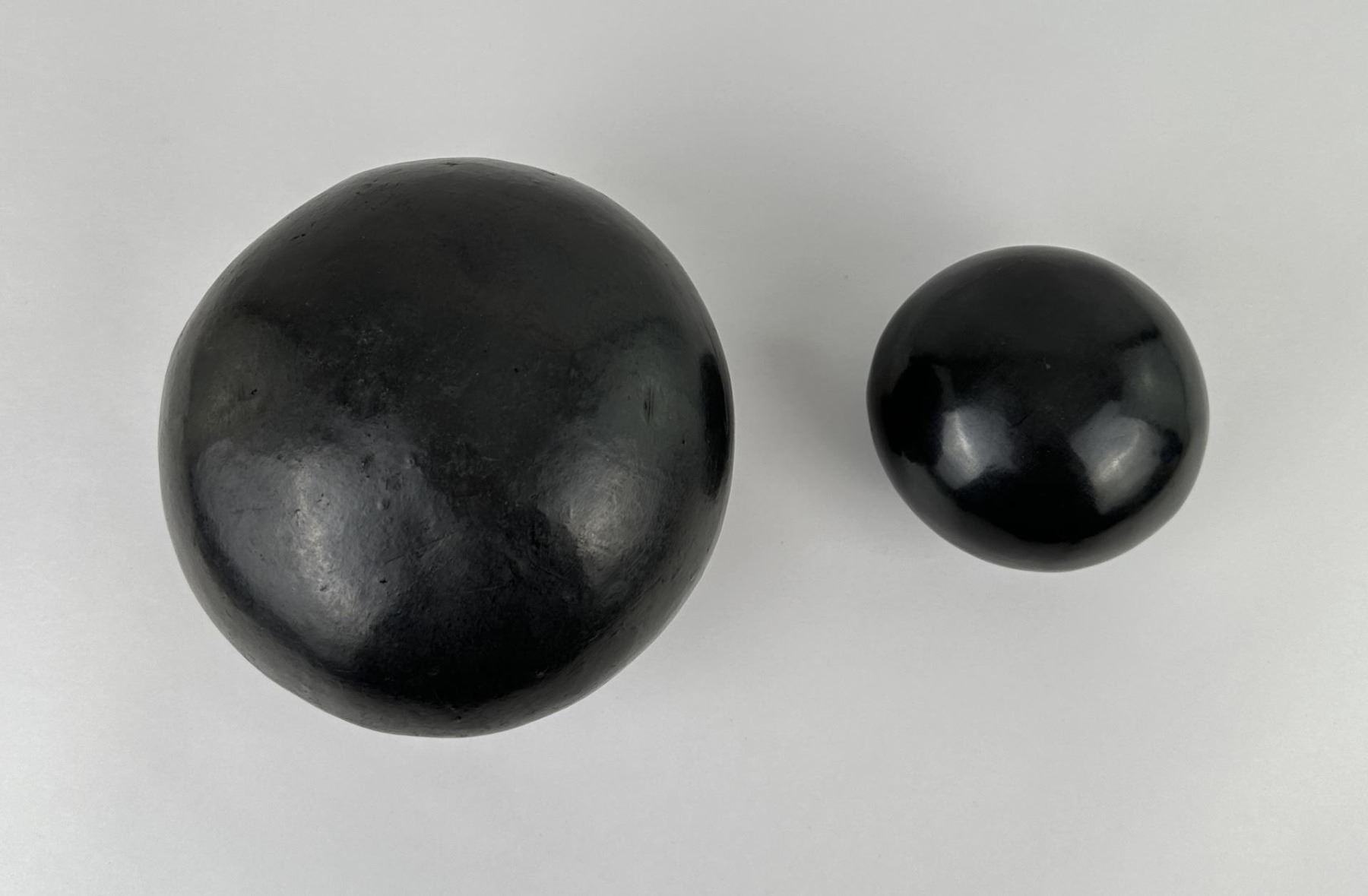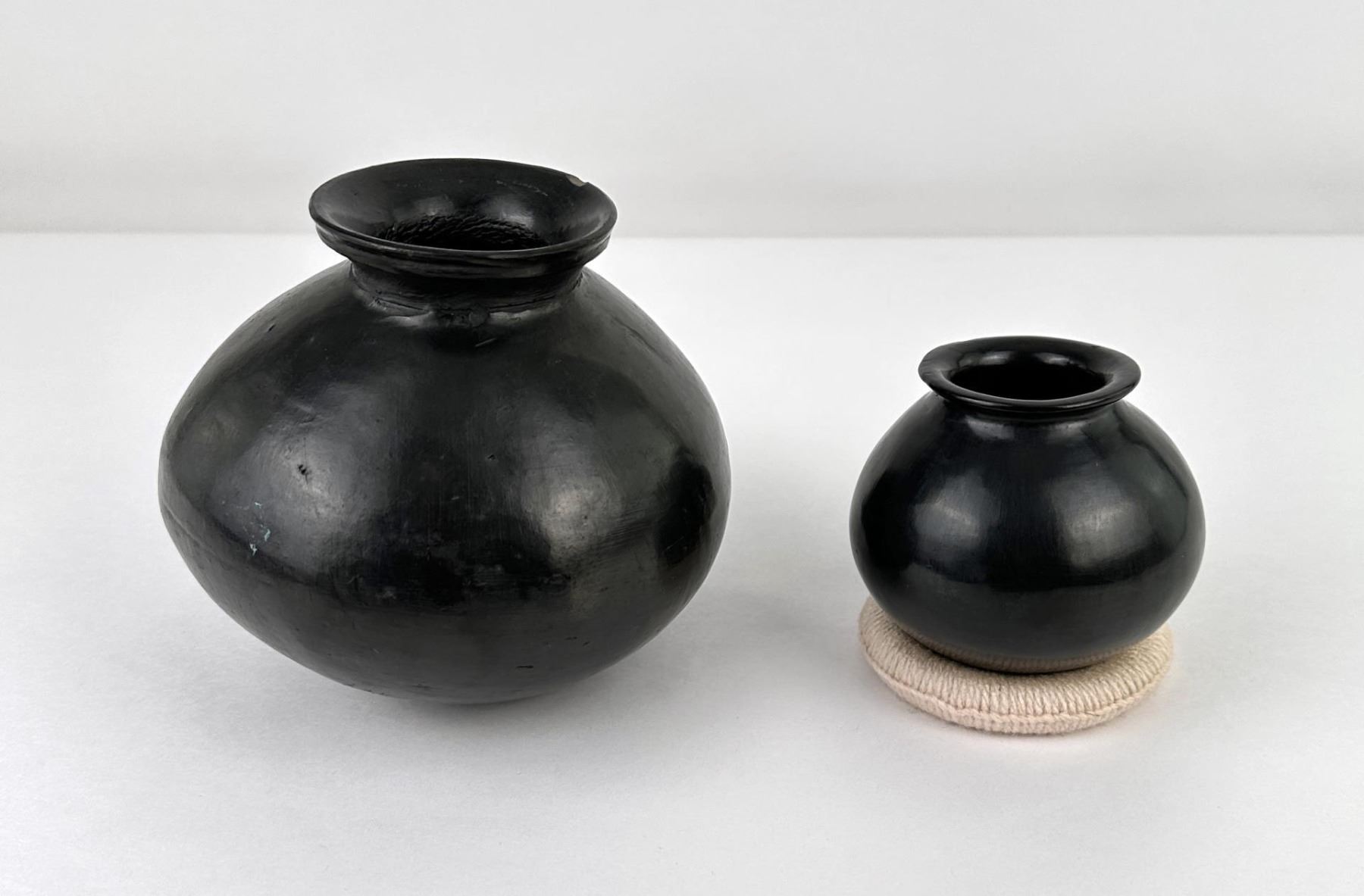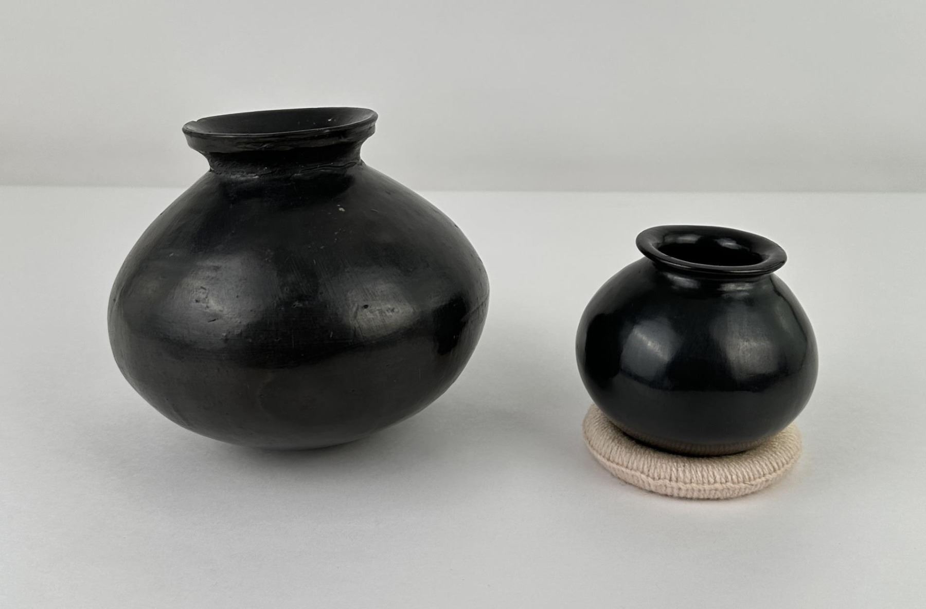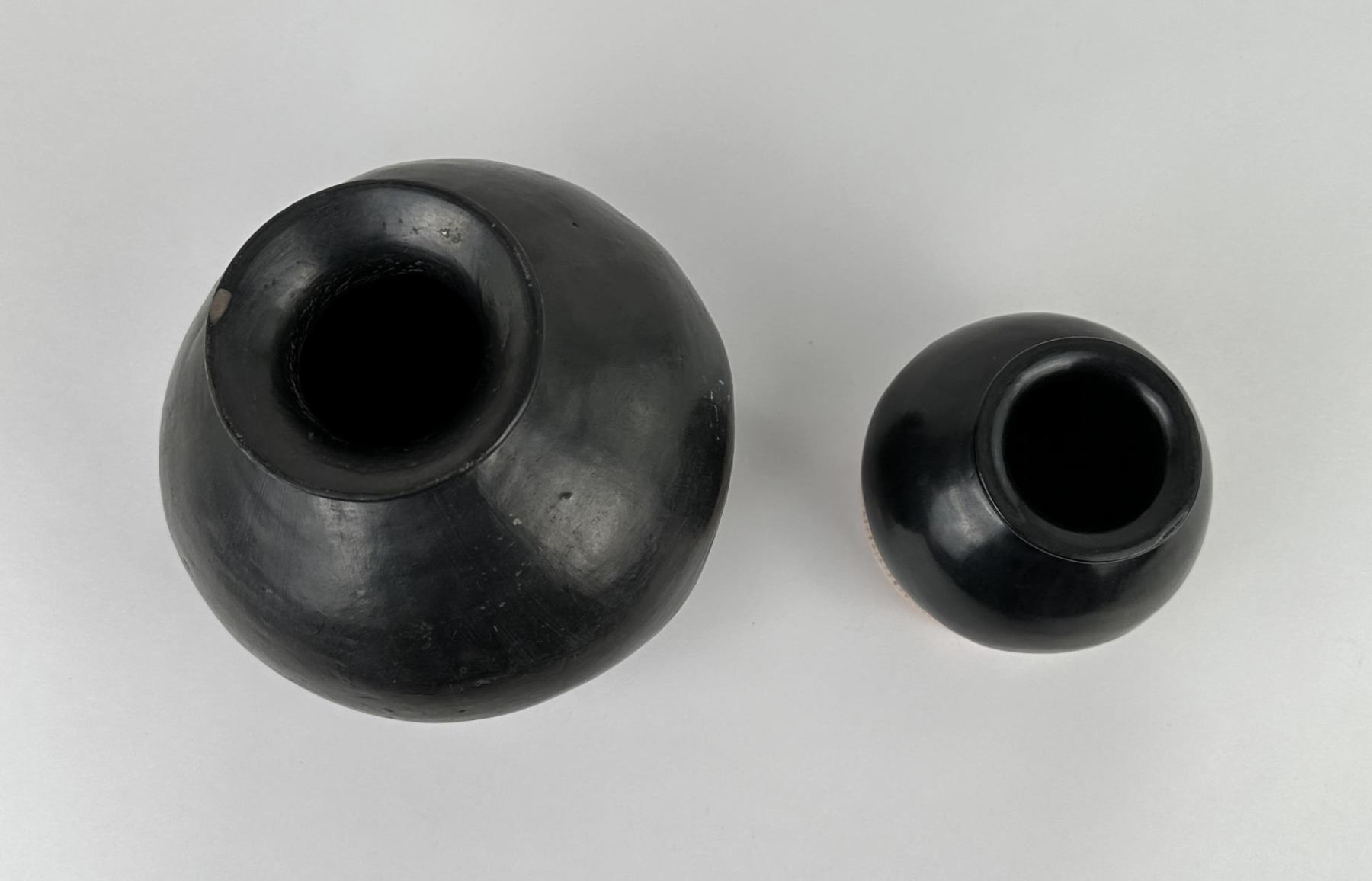 Larger pot 5 3/4" tall by 6 1/2" in diameter. Small lip chip in larger pot.