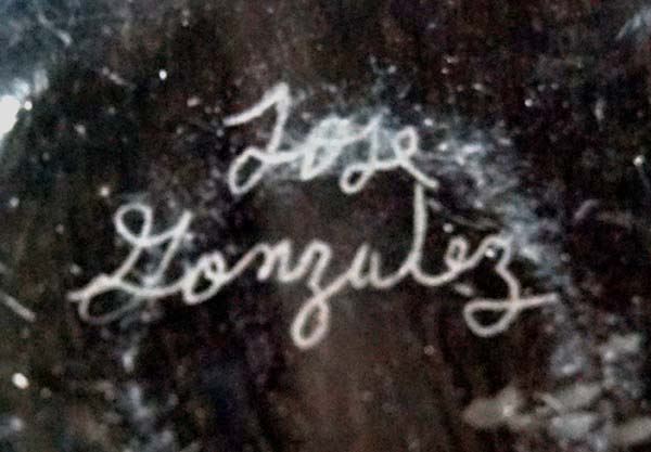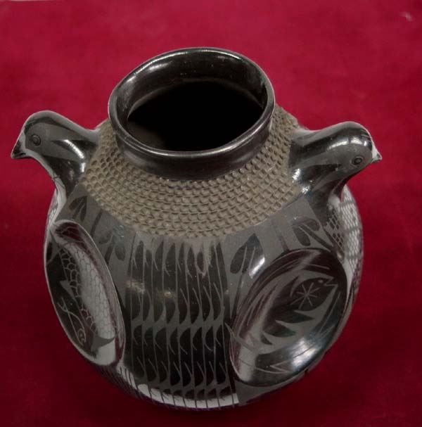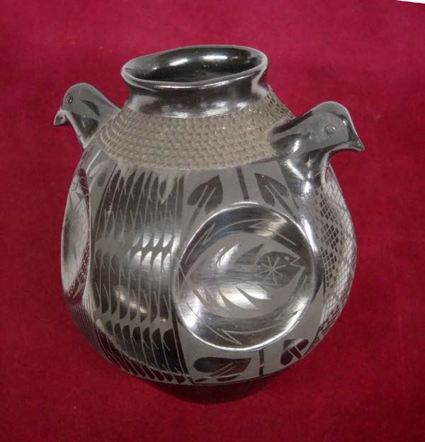 Mata Ortiz Black on Black Jar with Bird Handles. Signed on the bottom by Artist Jose Gonzalez this piece with its intricate eye dazzler design and carved raised design around its edge measures approx. 10.5'' x 10''. There is a small chip on the bottom of bill on one Bird.