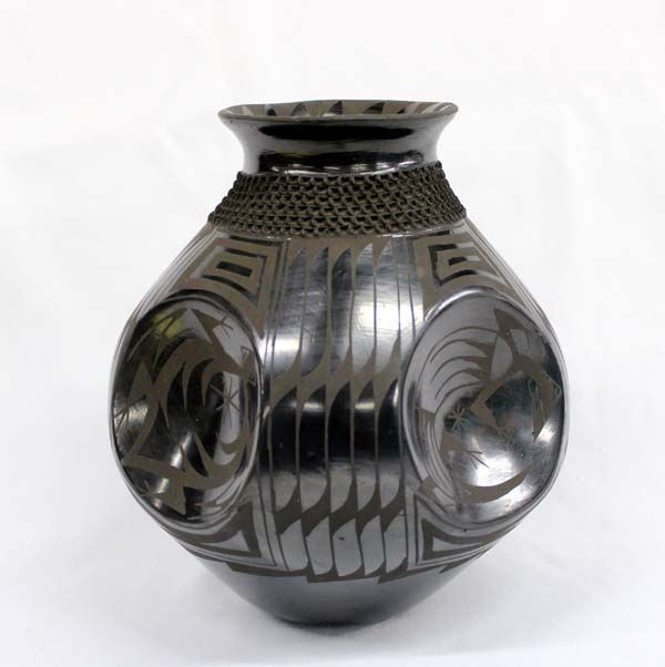 Exquisite Mata Ortiz Black on Black Pottery by Jose Gonzalez, unusual shape as pot has 4 large indentations, 2 of the indentations have lizards and the other 2 have turtles, beautiful geometric designs embellish this piece, neck of jar is textured, measures approx. 8''D x 9.5''H.