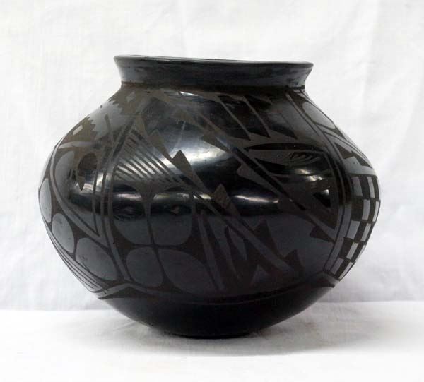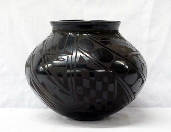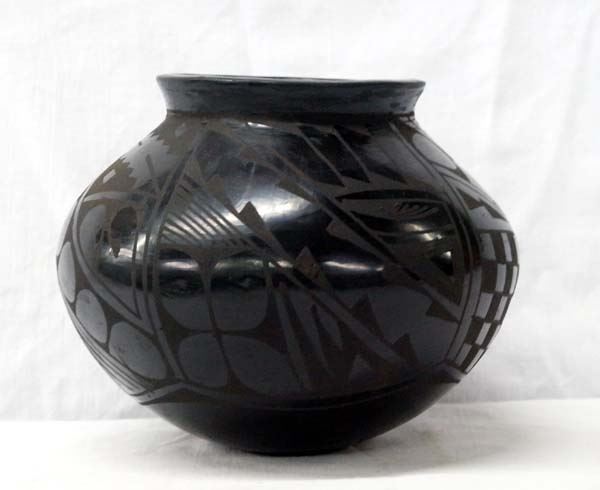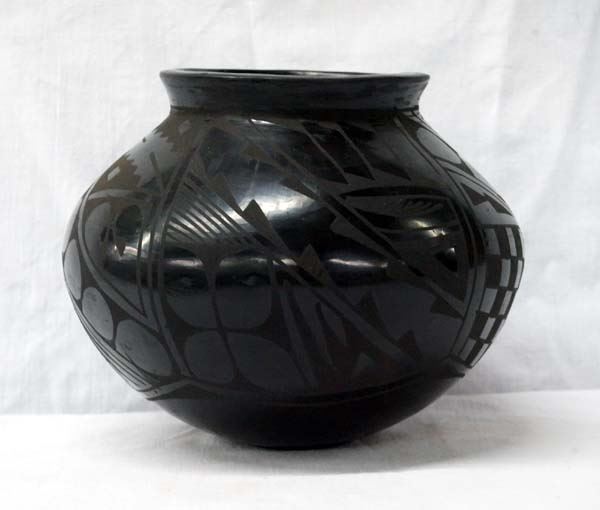 Mata Ortiz Black on Black by Sanbry, measures 5.5''H x 6.5''D, features geometric and abstract lines and designs, stylized feathers, signed on bottom by artist