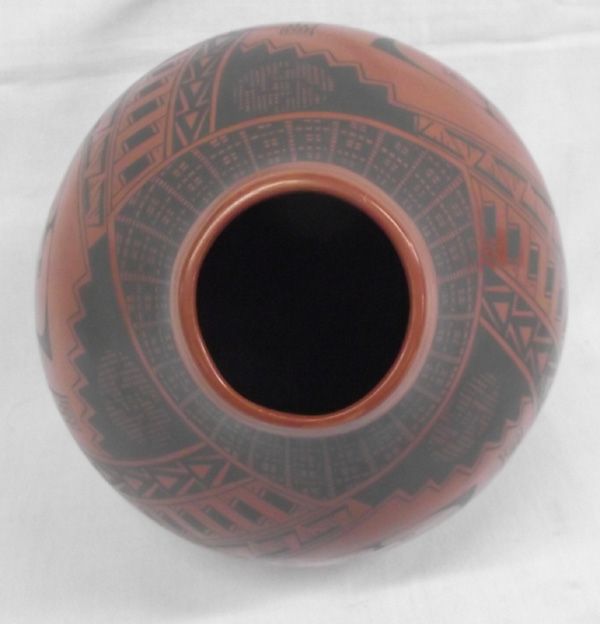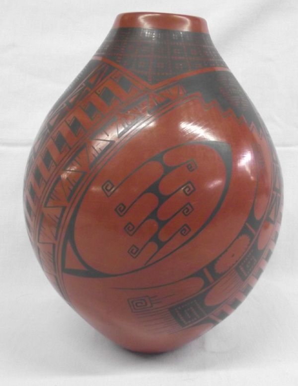 Mata Ortiz Black on Red Jar - Cesar Bugarini. Tall, oval jar with geometric black designs on reddish brown background by Cesar Bugarini. Measures 10.5''Hx8.5''W.