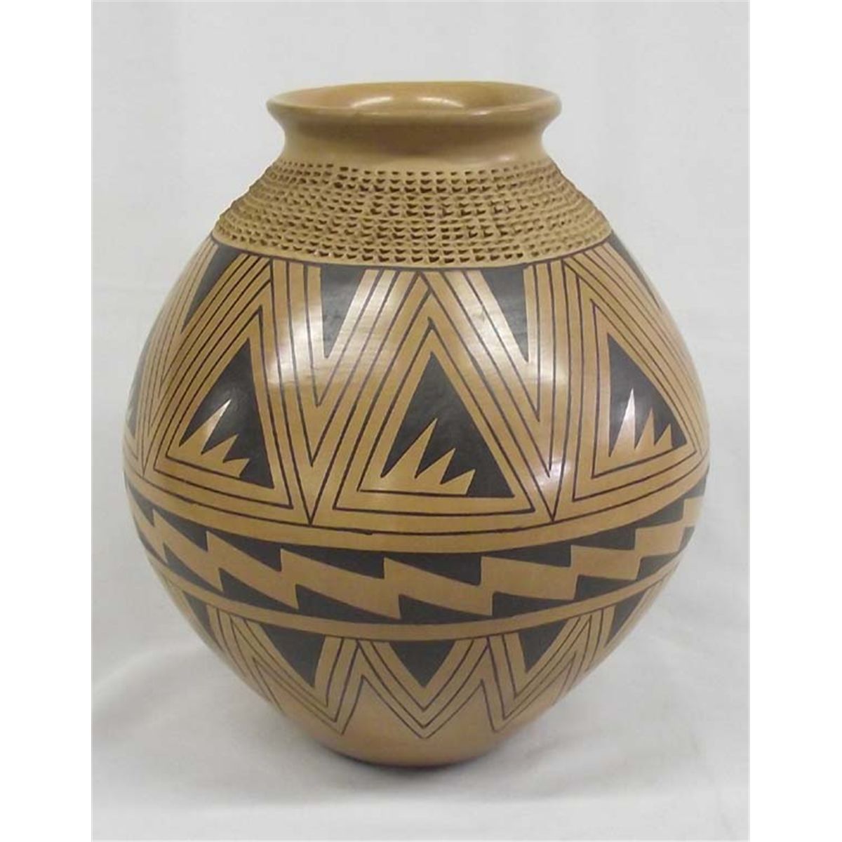 Mata Ortiz Black on Tan Textured Jar-Jesus Tena. Textured rim. Measures 10.5''Hx9.5''W. Signed on bottom, ''Jesus Tena.'' Buyers Pay Actual Shipping and Handling Charges(see terms and conditions for more information).