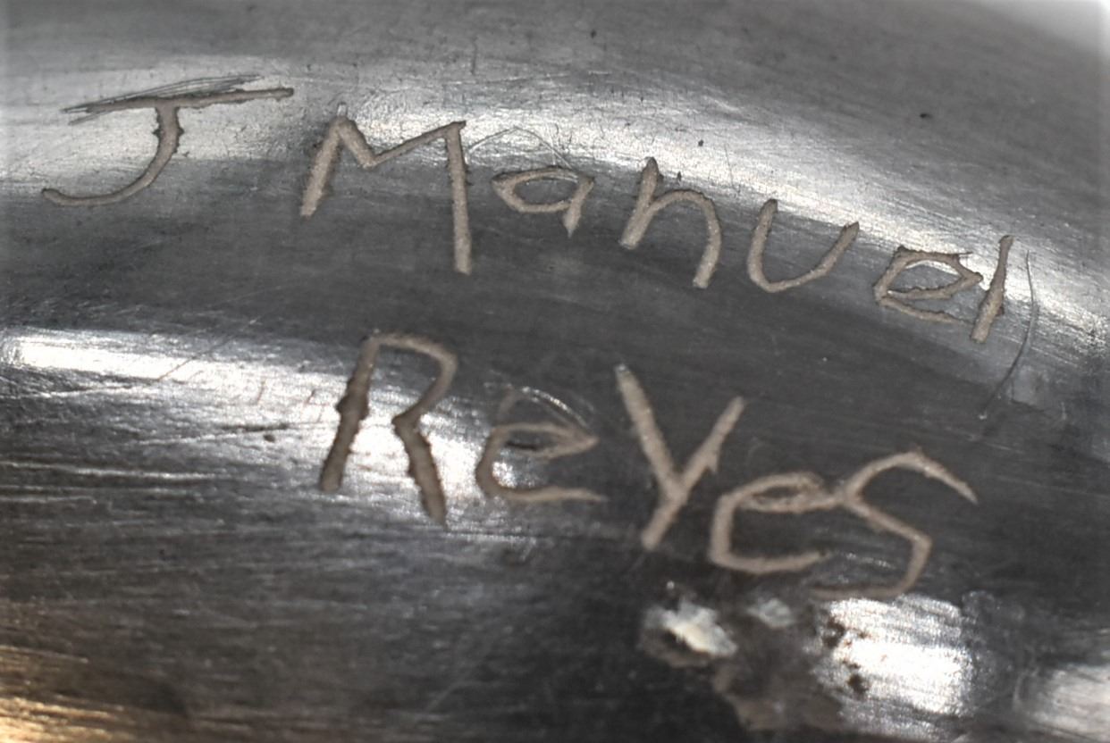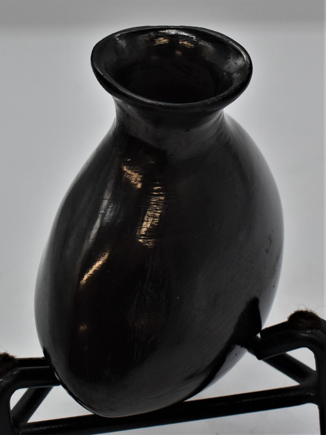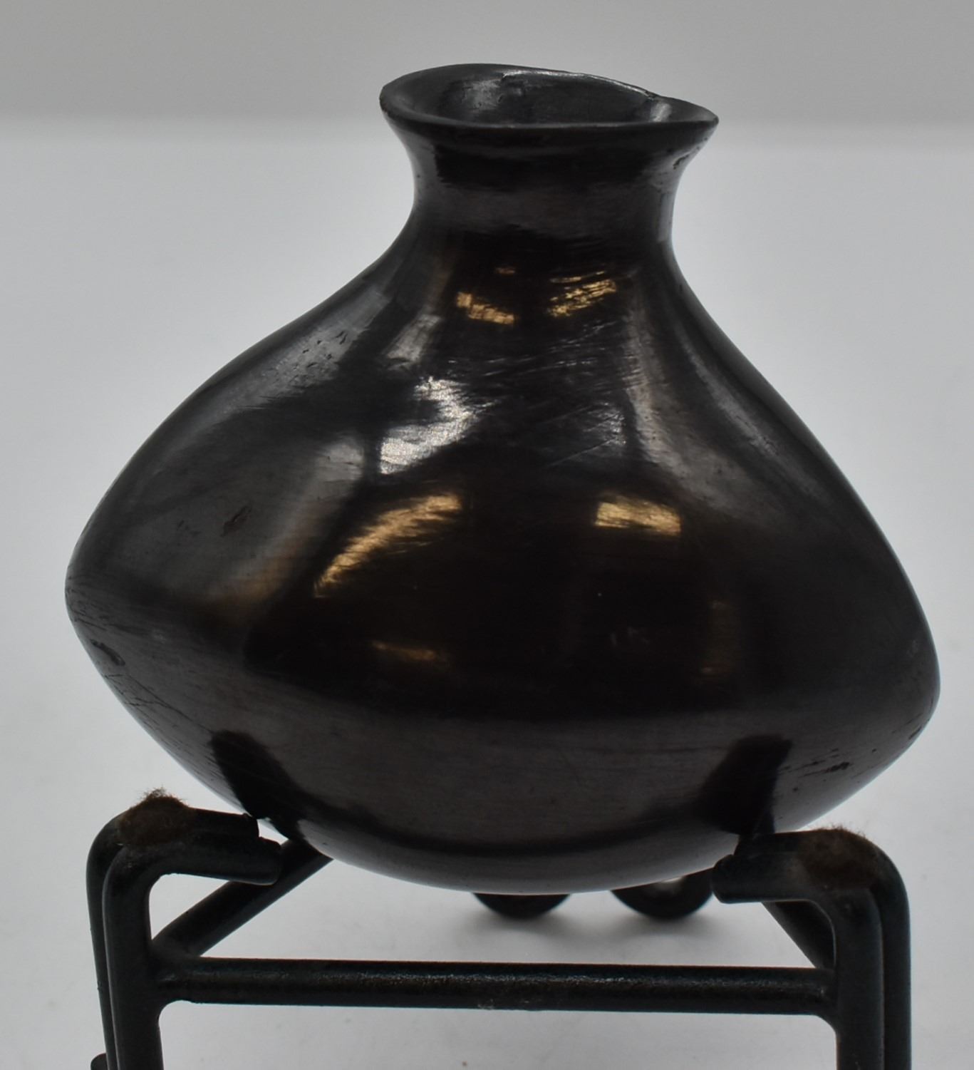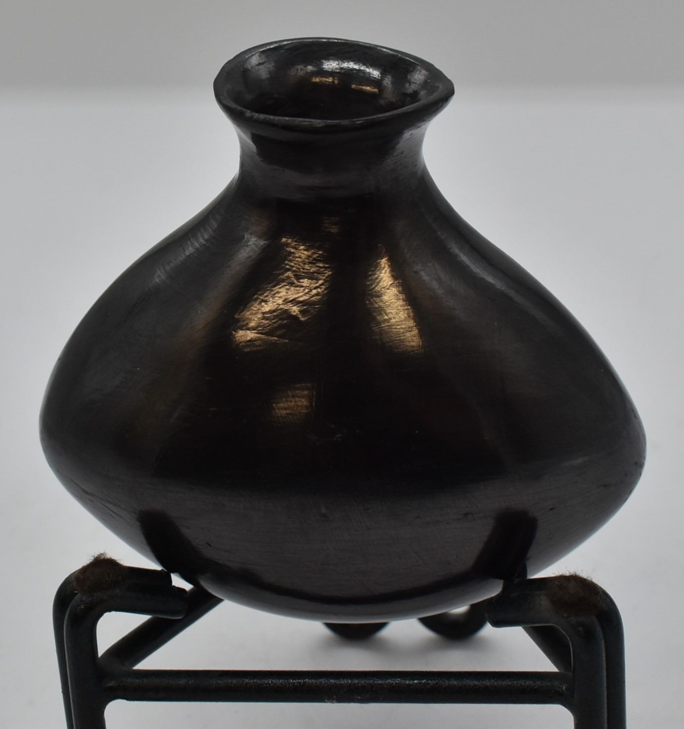 Mata Ortiz Blackware Pottery Vase by J. Manuel Reyes, highly burnished football shaped pot measuring 4'' x 4.5'' and is signed on the bottom, comes with stand