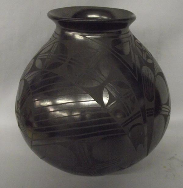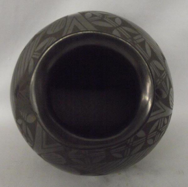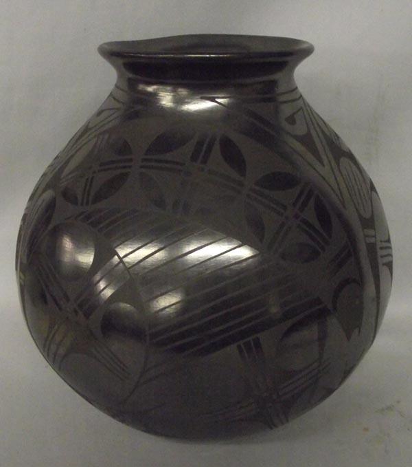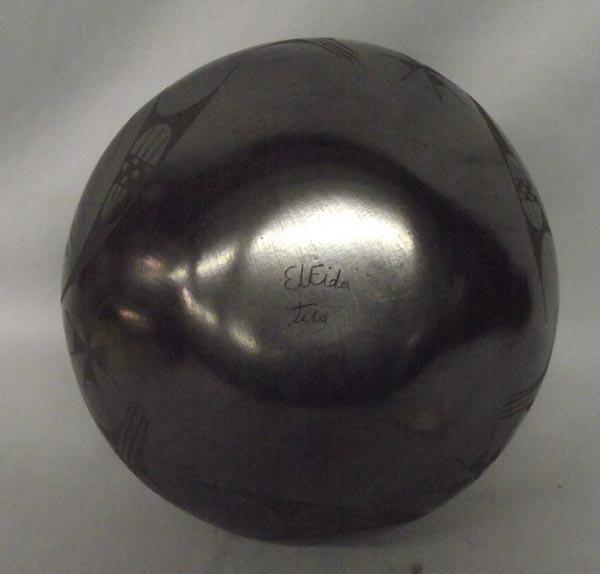 Mata Ortiz Black on Black Highly Burnished Stylized Designed Pot by Elfida Tena, measures approx. 10.5'' x 9.5''Diameter. Buyers Pay Actual Shipping and Handling Charges(see terms and conditions for more information)
