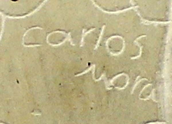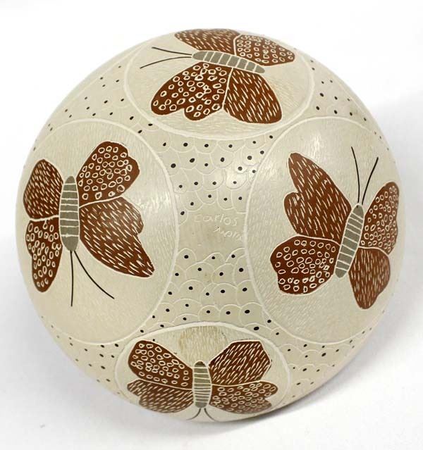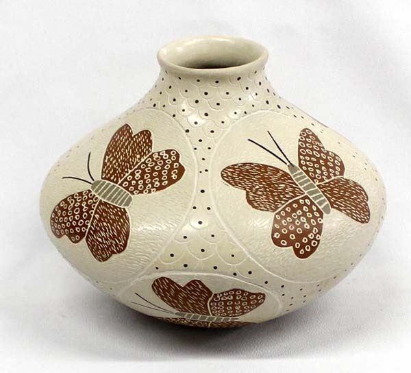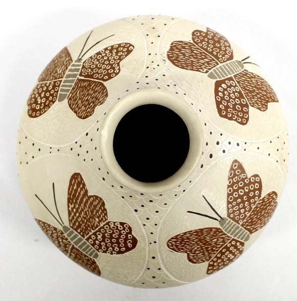 Mata Ortiz Butterfly Pottery Jar by Carlos Mora, measures 6.5'' x 5'' and is signed on the bottom, beautiful sgraffito butterflies, lines, and designs, chip on rim