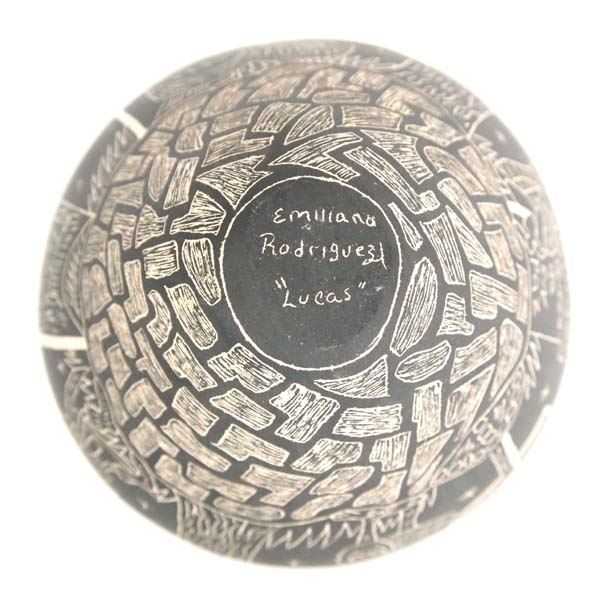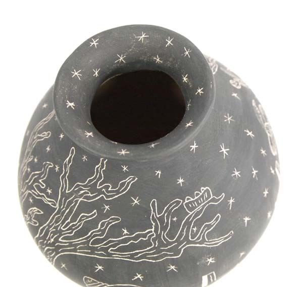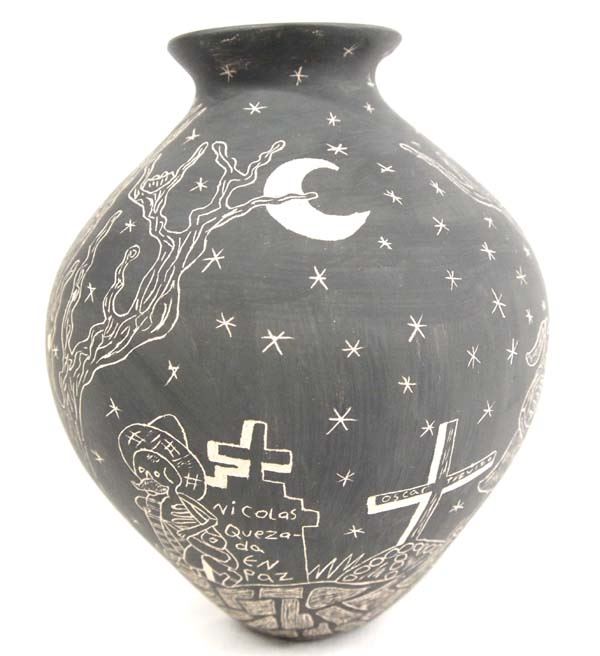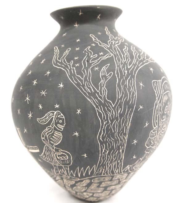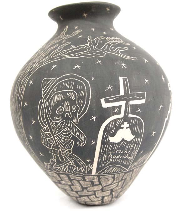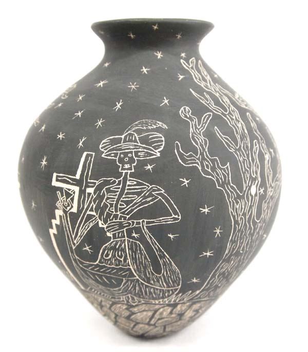 Phenomenal Mata Ortiz Sgraffito Day of the Dead Jar by 10 year old Emiliano ''Lucas'' Rodriguez (see photo), measures 7''H x 6''D, exquisite carving on this piece, signed on bottom by artist