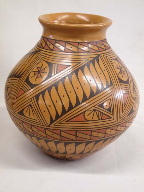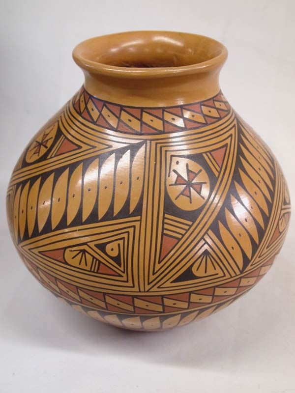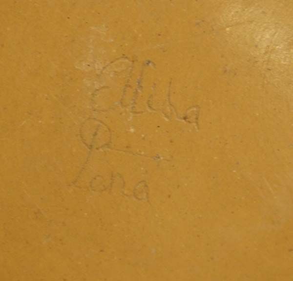 Mata Ortiz Directional Bowl by Elfida Tena, name etched on bottom of the pottery. Measures approx. 9'' x 8''. Bowl has 8 directional crosses on the bottom of the Jar. The Jar is Polychrome, red, black and tan.