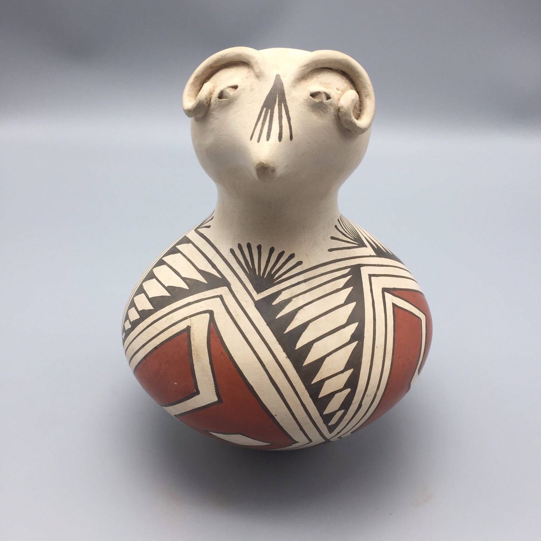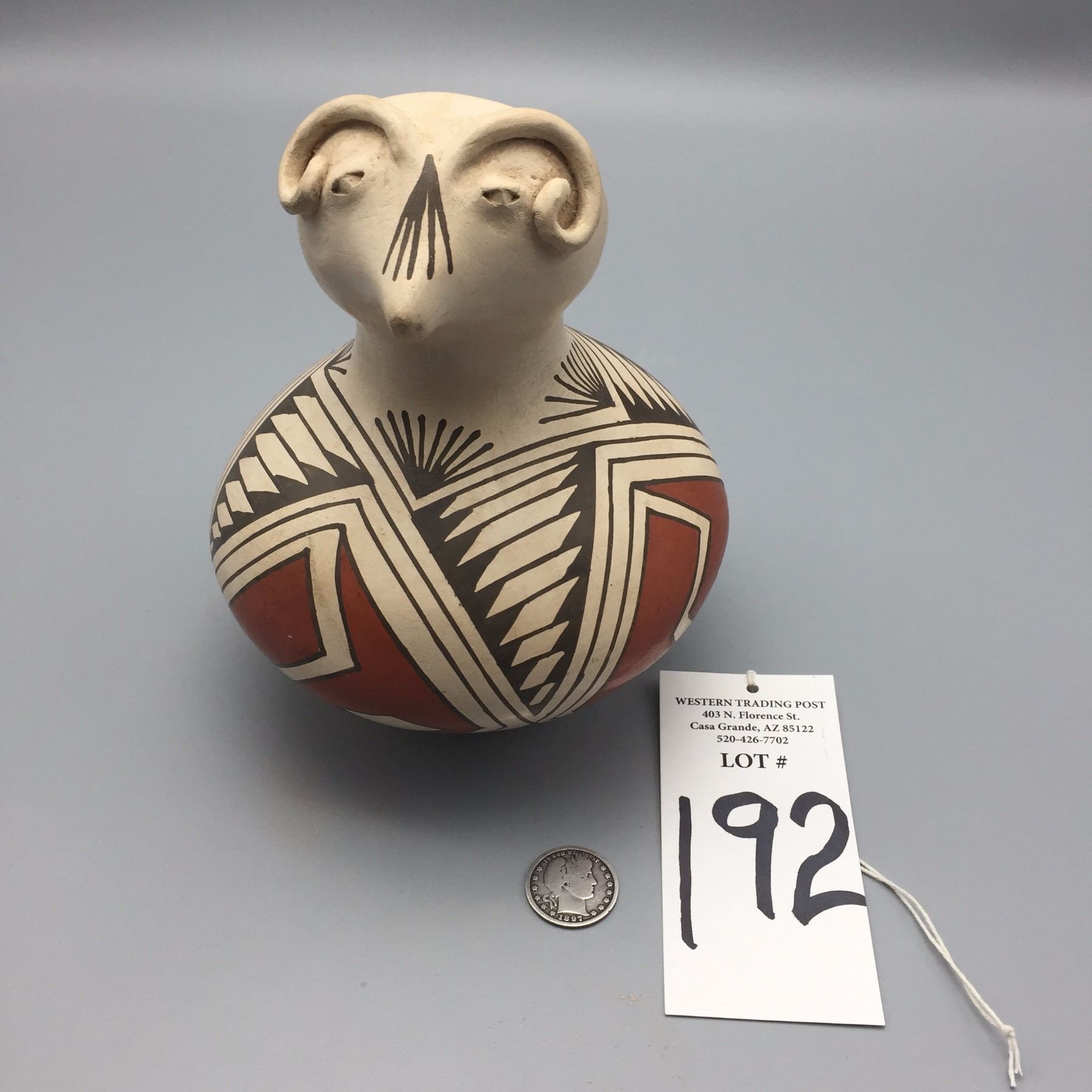Maker: Dulces M. Melero. Approx. Age: Fairly modern, NOS. Size: Measures 5 1/2” w x 7 1/4” h. Additional Info: Mata Ortiz ram head effigy pot. Condition: Good, New, old stock (NOS) from dealer who is retiring. Please look closely at the pictures - they are an important part of our description. Shipping: There will be a $8 handling / packaging fee for shipping this lot. The actual cost of postage will be added on top of that.