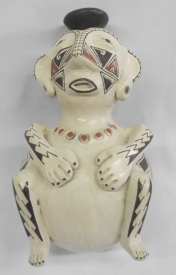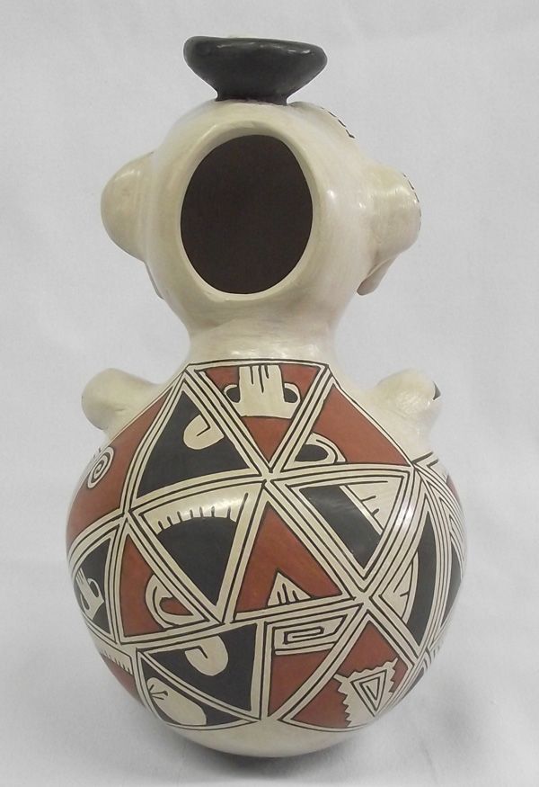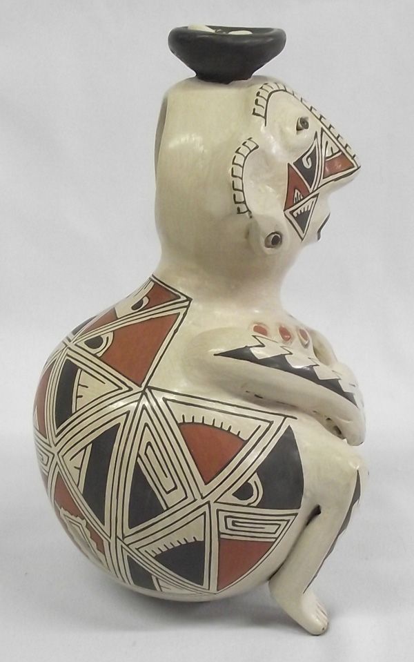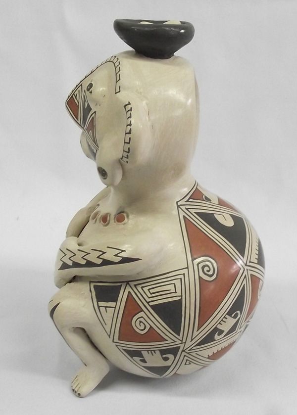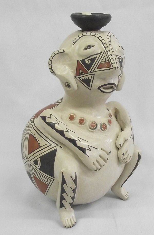 Mata Ortiz Effigy Pottery Jar - Armando Rodriguez. Squatting figure with bowl of potatoes (?) on its head. Sits very well and shows fine craftsmanship. Measures 7.5''H x 5''W and is signed on the bottom.