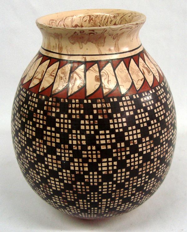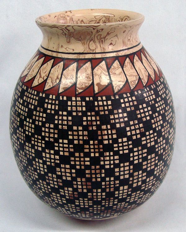 Mata Ortiz Eye Dazzler Jar - Luis Ortiz. Beautiful marbelized jar with eye dazzler pattern in black and feather designs around the neck. Measures 7.5''H x 6.5''W. Signed on Bottom.