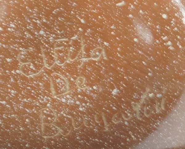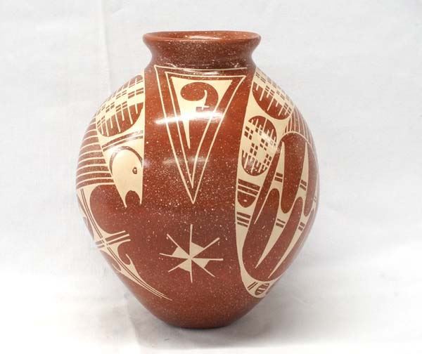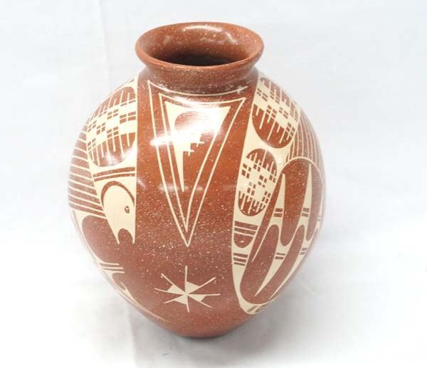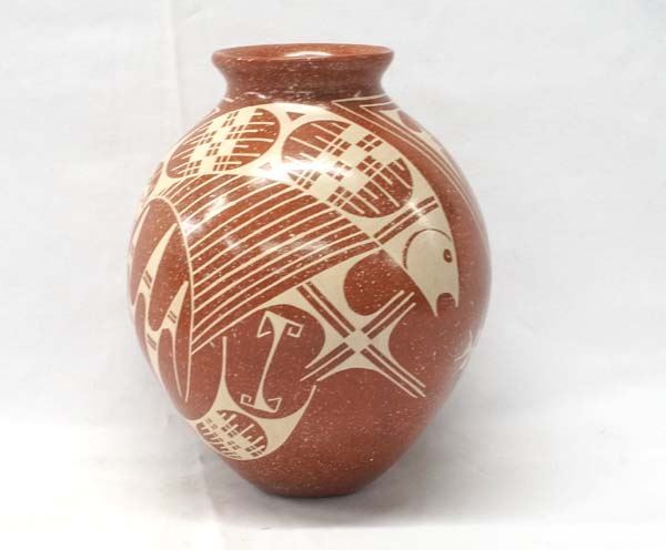 Stunning Mata Ortiz Cream on Brown Fighting Fish Jar by Elfida de Bugarini, spattered paint background, signed on bottom by artist, measures 8''H x 6.5''