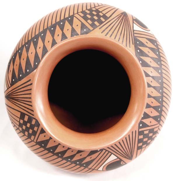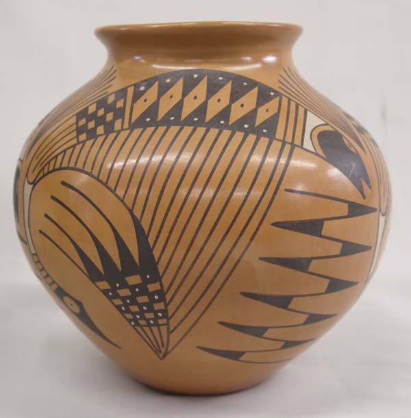 Mata Ortiz Fish Polychrome Painted Jar - Jesus Tena. Large fish are swimming around the medium size jar. 8''H x 9'' diameter.