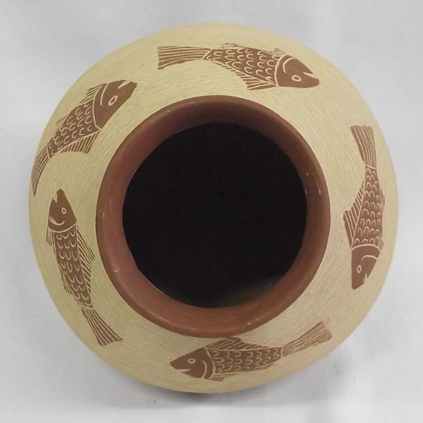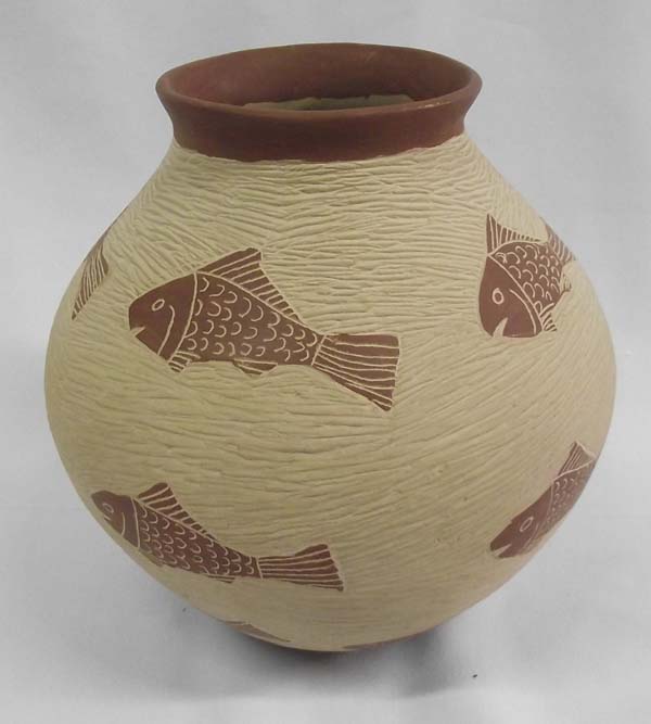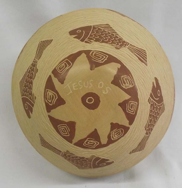 Mata Ortiz Fish Pottery By Jesus OS. Measures approx. 7''H x 7 1/2''W. Fish on sides with texturing. Buyers Pay Actual Shipping and Handling Charges(see terms and conditions for more information).