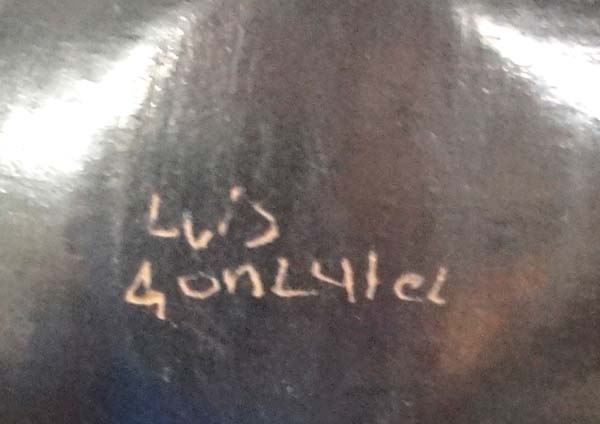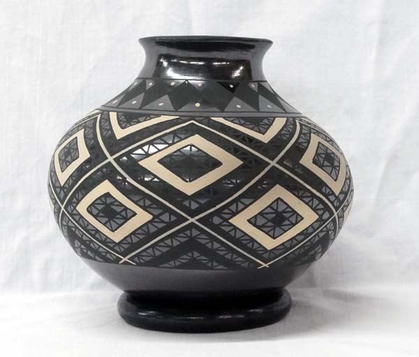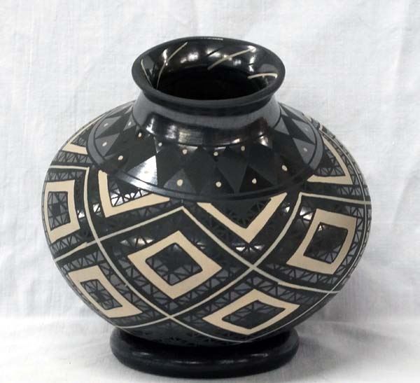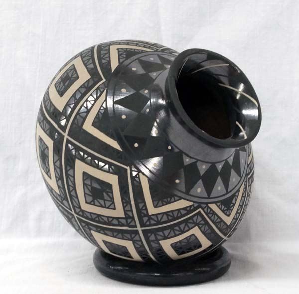 Beautiful Mata Ortiz Geometric Jar by Luis Gonzalez, gun metal finish, measures 5''H x 6''D, comes with pottery ring, flared rim, gorgeous rim painting