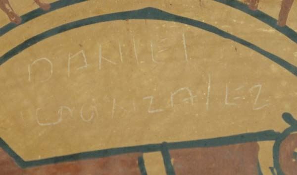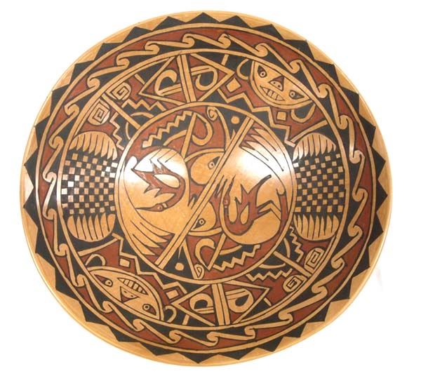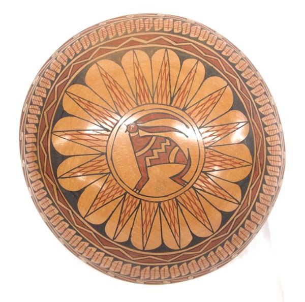 Stunning Mata Ortiz Geometric Polychrome Bird Bowl by Daniel Gonzalez, measures 4''H x 12.5''D, very busy bowl indicative of this artist's style, features birds, waterwave designs, faces, and other lines and designs, the bottom of this jar features a rabbit and stylized feather designs, equally beautiful on both the inside and outside, signed on bottom by artist