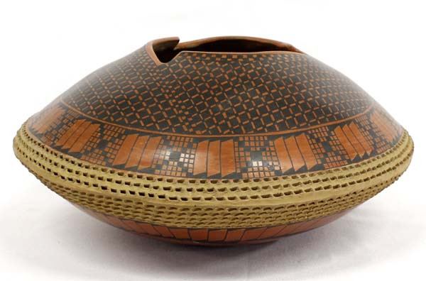 Beautiful Mata Ortiz Geometric Pottery Pillow Jar by Benjamin Soto, signed by the artist and measures 13''D x 6''H, textured midline, stunning cutaway rim and heavy, thick walled pottery