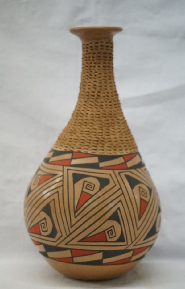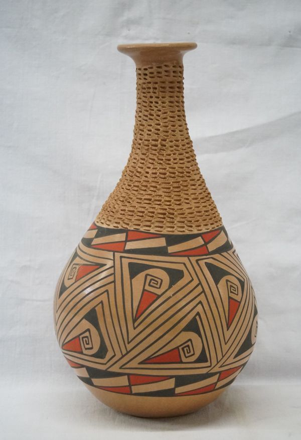 Mata Ortiz Polychrome Geometric Pulled Spout Jar by Lucie Soto, measures 11'' x 7'', signed on bottom by artist