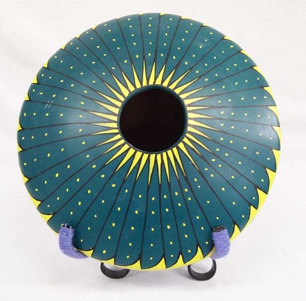 Mata Ortiz Green & Yellow Sunflower Pottery Jar by Luis Ortiz. Complete with stand as shown, this colorful piece measures approx. 12'' in diameter and is 4.5'' tall.