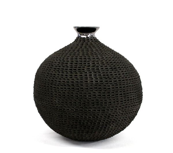 Mata Ortiz Highly Textured Black Olla by L. Soto, measure 6.5''H x 6.5''D, features highly textured body, pulled burnished spout in gun metal finish