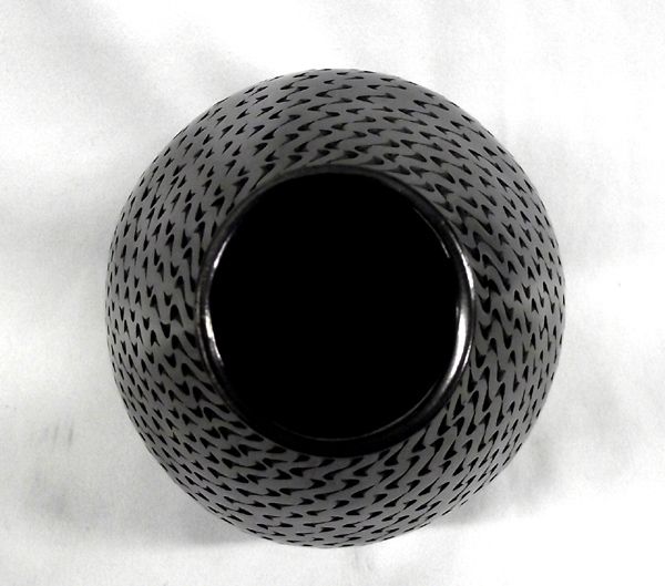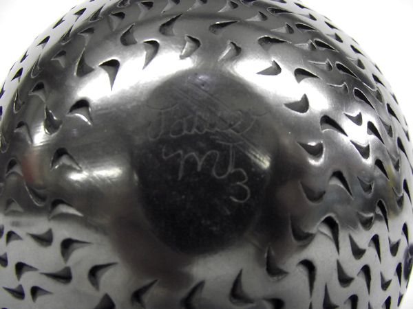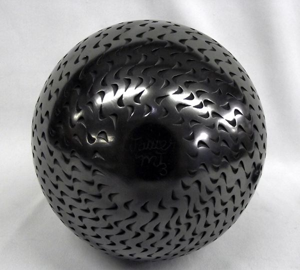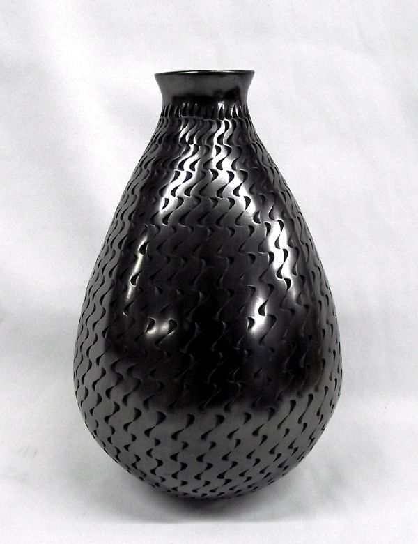 Mata Ortiz Highly Textured Olla by Javier Martinez, measures 8.5''H x 5.5''W, signed on bottom by artist, gun metal highly burnished finish, pulled spout, vessel is completely textured with the exception of the top of the rim, lovely piece