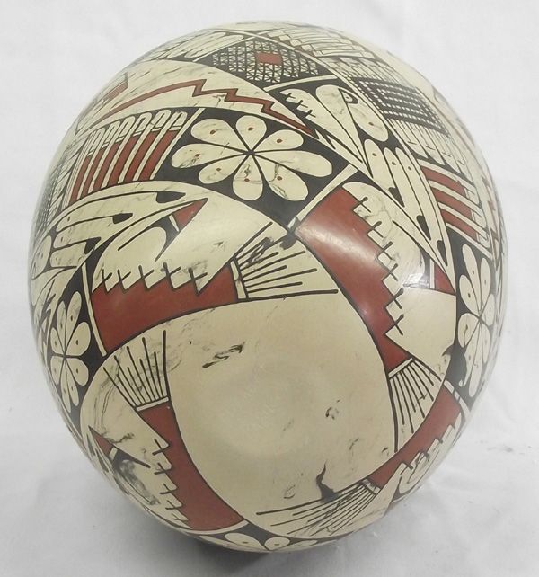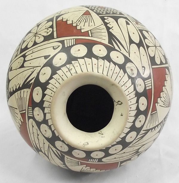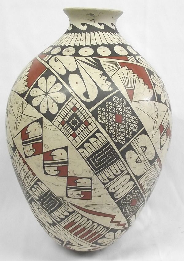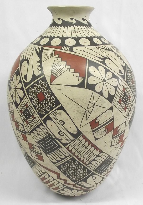 Mata Ortiz Large Museum Quality Jar - E Pacheco. Simply stunning artwork in pottery. The jar has an egg shape and stands balanced without a pot ring. On a marbelized body base, the artist has used red and black to paint parrots, flowers, lightning, waves and other designs. Signed on the bottom, ''Elizabeth Pacheco.'' There are some very tiny spots on the bottom where paint has rubbed off. Measures 15''H x 11''W and comes with a tag attesting to its production in Mata Ortiz and that the artist is Pacheco.