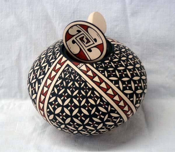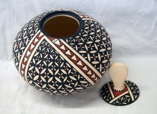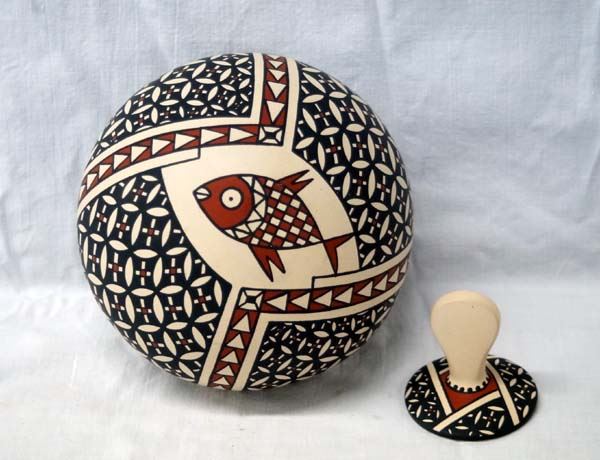 Fabulous Mata Ortiz Polychrome Lidded Jar by Gerardo Ledezma Veloz, features eye dazzling designs, lid is painted on both sides, fish design on bottom, signed by artist, measures 6''H x 5.75''Picture of the artist Ledezma with his pottery comes with the pottery.