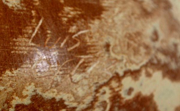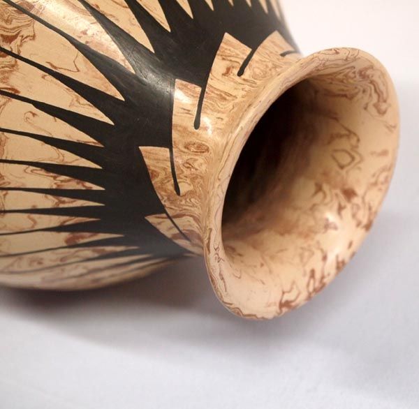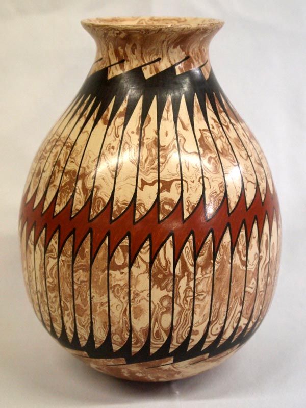 Mata Ortiz Marbelized Jar - Luis Ortiz. An expertly finished jar with opposing feather design that creates an interesting midline design. Thin walls and perfectly symetrical. Fine work by the artist, Luis Ortiz, who signed the bottom. Measures 8.5''H x 6''W.