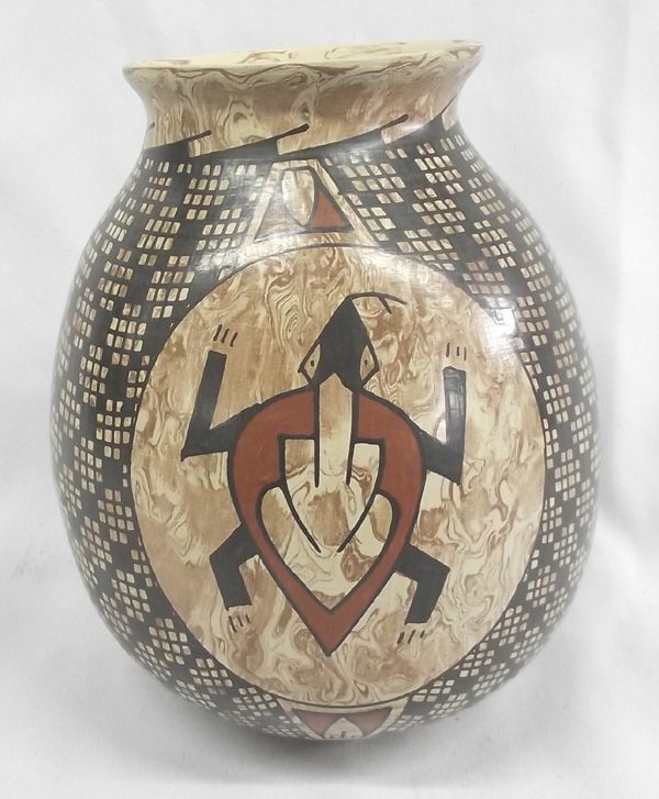 Mata Ortiz Marbelized Jar Toad Design - Luis Ortiz. For horny toad type figures surround the jar and are separated by an eye dazzler design of diamonds. Nice craftsmanship. Measures 8''H x 6.5''W.