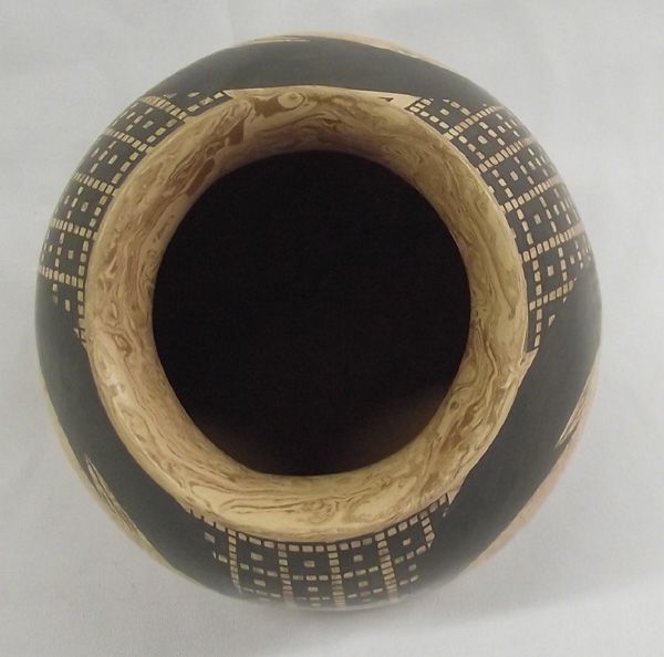 Mata Ortiz Marbelized Rabbit Design Jar - L Ortiz. Rabbits reside in 3 large black ovals on this jar, with large eye-dazzler type squares design on main body. Another fine pottery jar by Luis Ortiz. Measures 8''H x 6''W. Mata Ortiz is a small village in the state of Chihuahua, Mexico. The potters of Mata Ortiz create contemporary works of art, often incorporating Mimbres designs shared by the Southwest, Native American cultures.