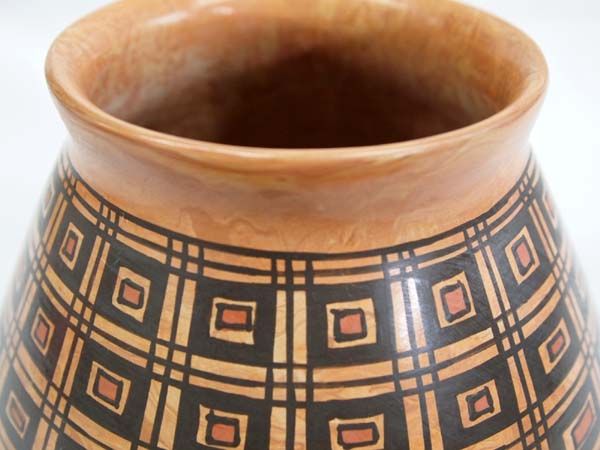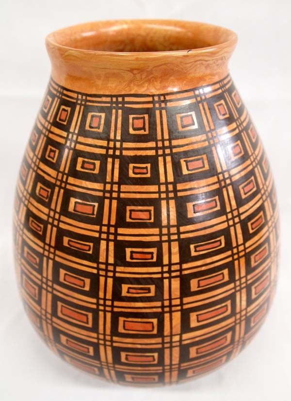 Mata Ortiz Marbelized Tall Jar - Tito Enriquez. Thin-walled, lovely symetrical shape on this jar that stands balanced. Black and red graduated size rectangles on a white and brown marbelized background. Signed on the bottom, Tito Enriquez. Measures 9.5''H x 7.5''D.