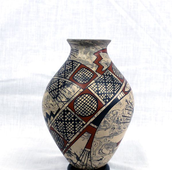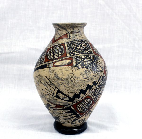 Mata Ortiz Marbleized Clay Olla, measures 7.25''H x 5.5''W, Paquime' inspired designs amid checkerboard designs, pulled spout