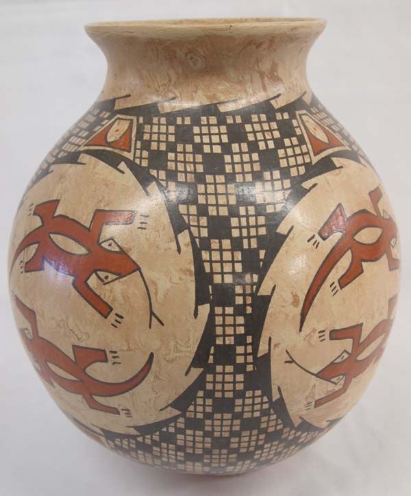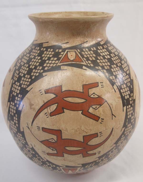 Mata Ortiz Marbleized Polychrome Lizard Pottery by Luis Ortiz. Exquisite paint work on this jar. 10.5''H x 9.5'' diameter.