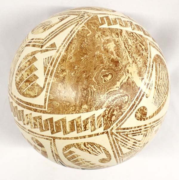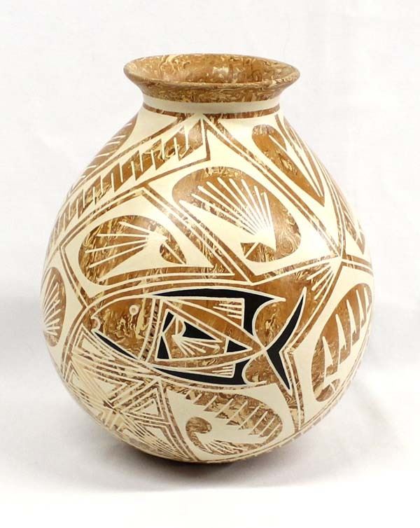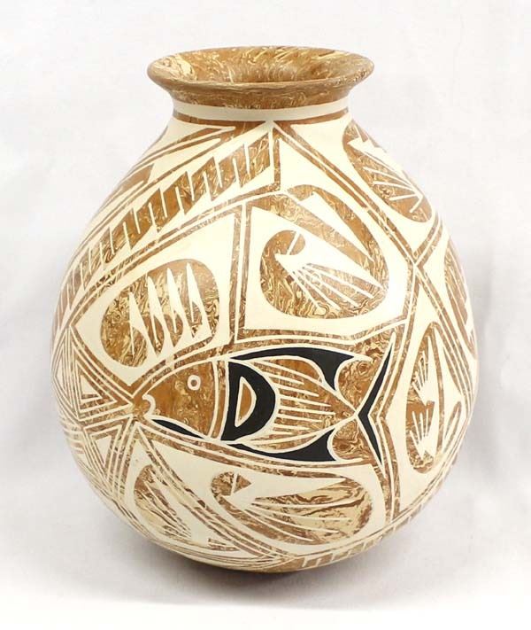 Beautiful Mata Ortiz Marbleized Pottery Jar by Efrain Lucero Andrew, measures 8'' x 9'' and is signed on the bottom, features a very unique combination of marbleized clay and Paquime' inspired lines and designs, flared rim