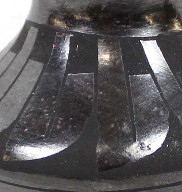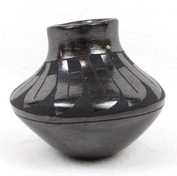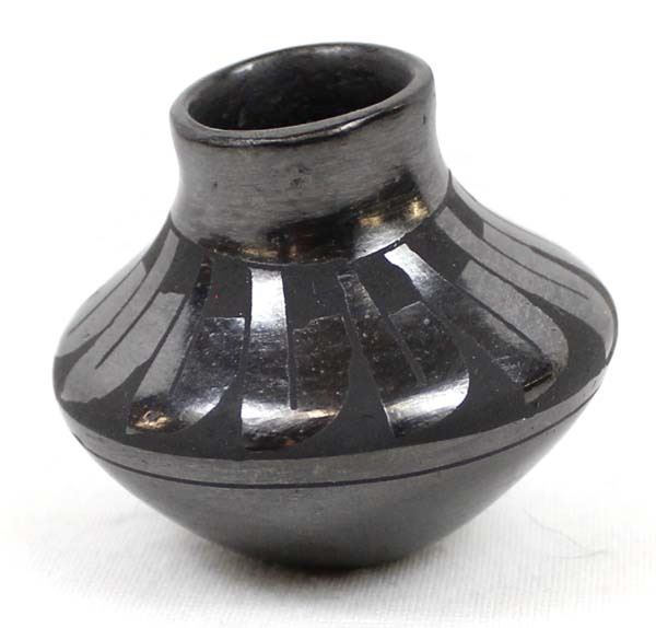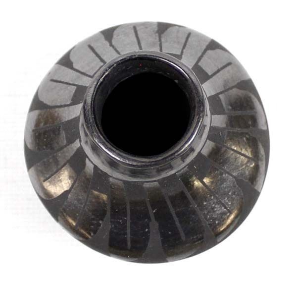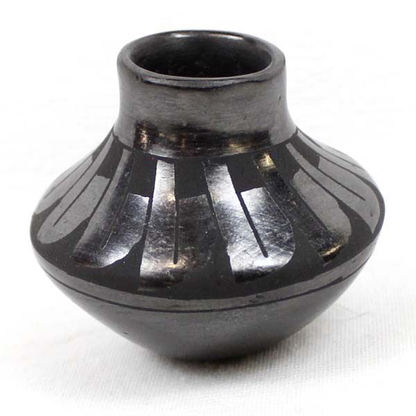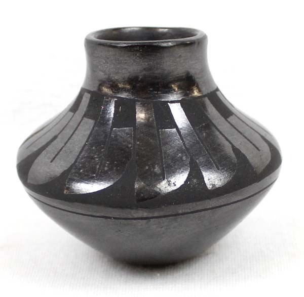 Mata Ortiz Miniature Pottery Jar by Tona Guillen, measures 2'' x 2'' and is signed on the bottom, features black on black stylized feather designs and is highly burnished