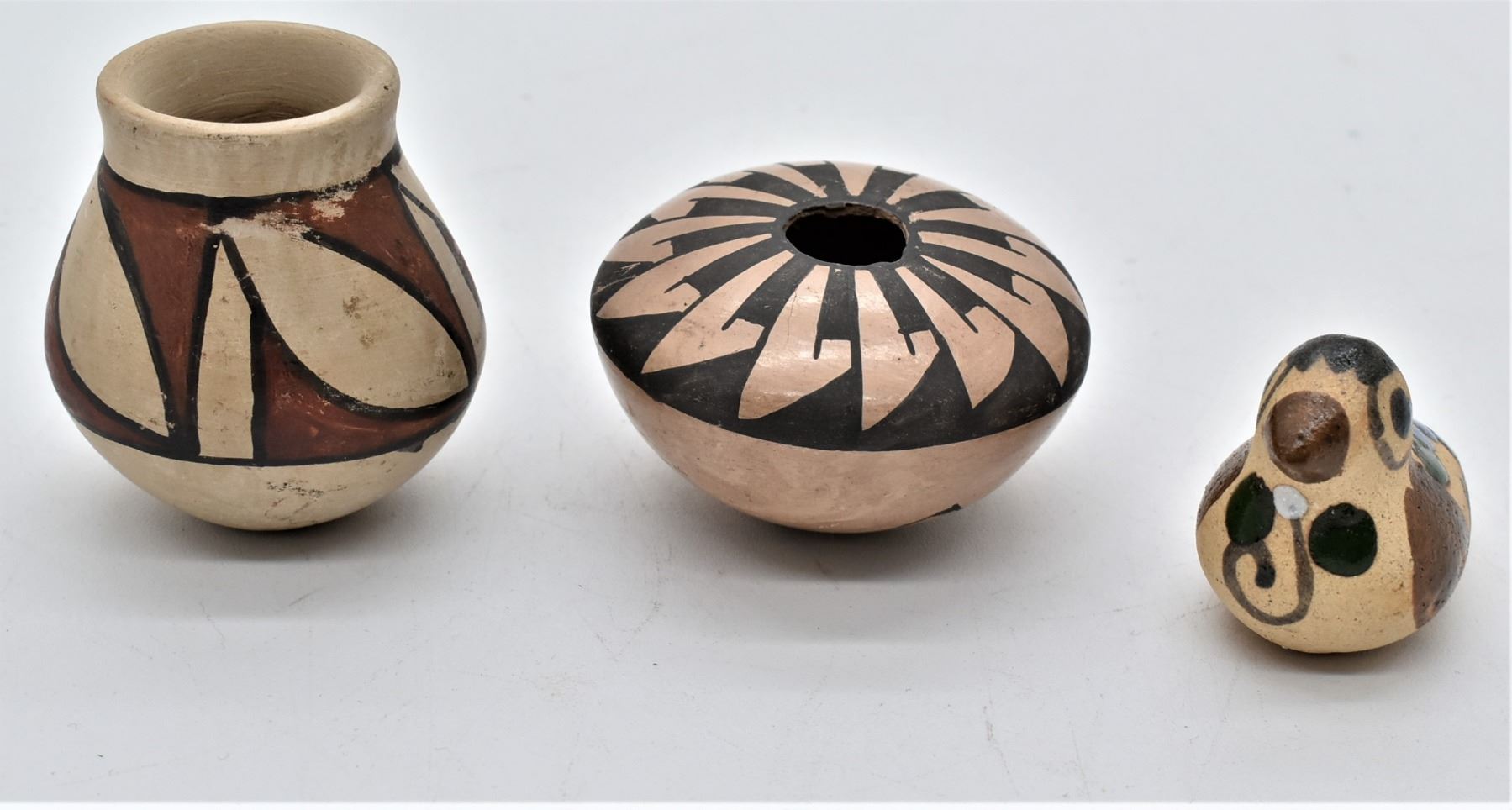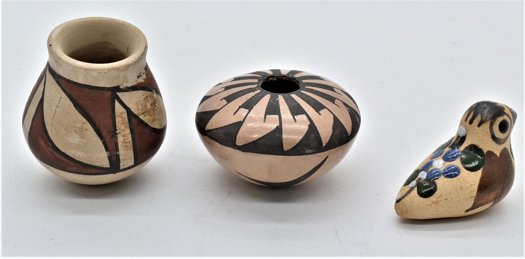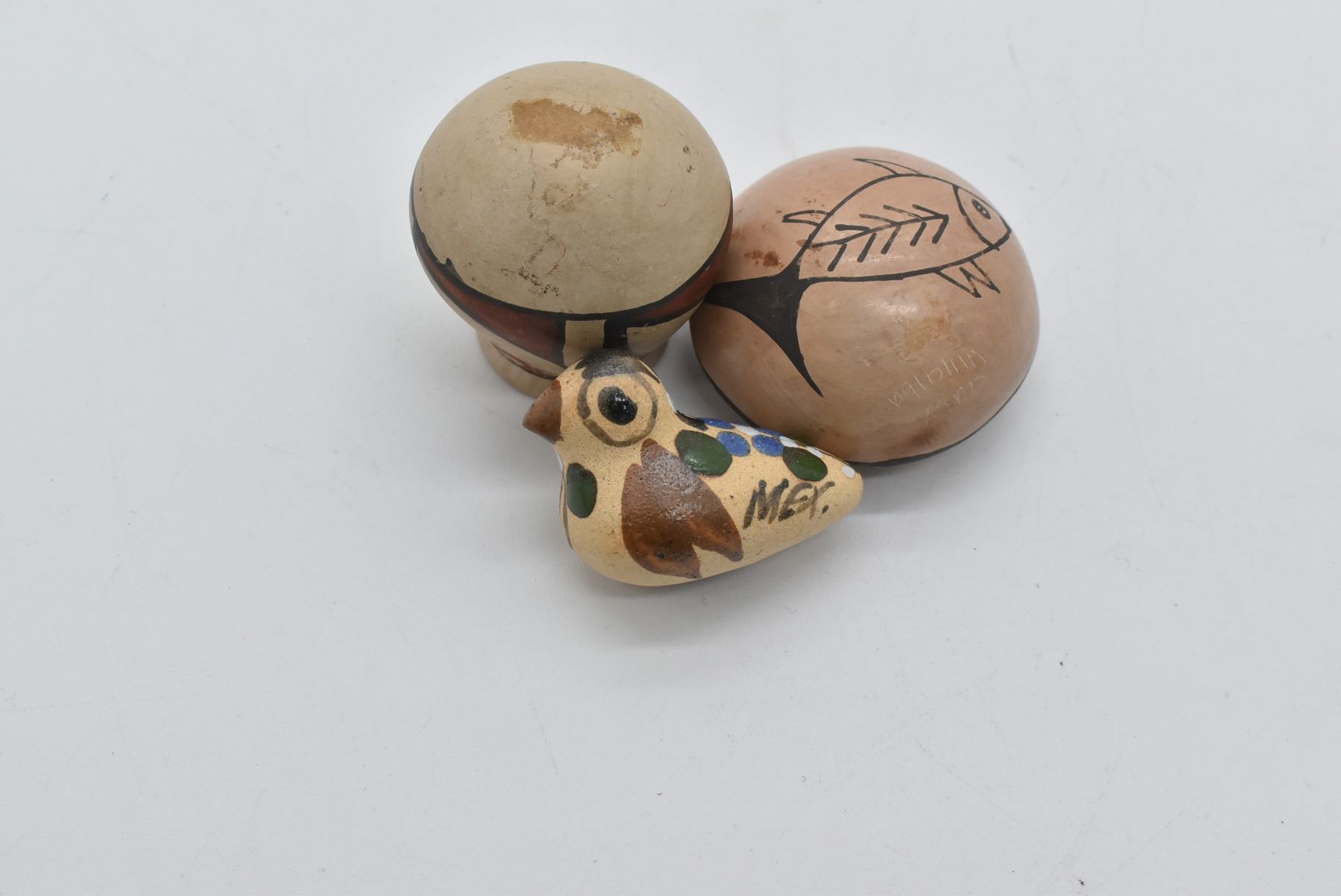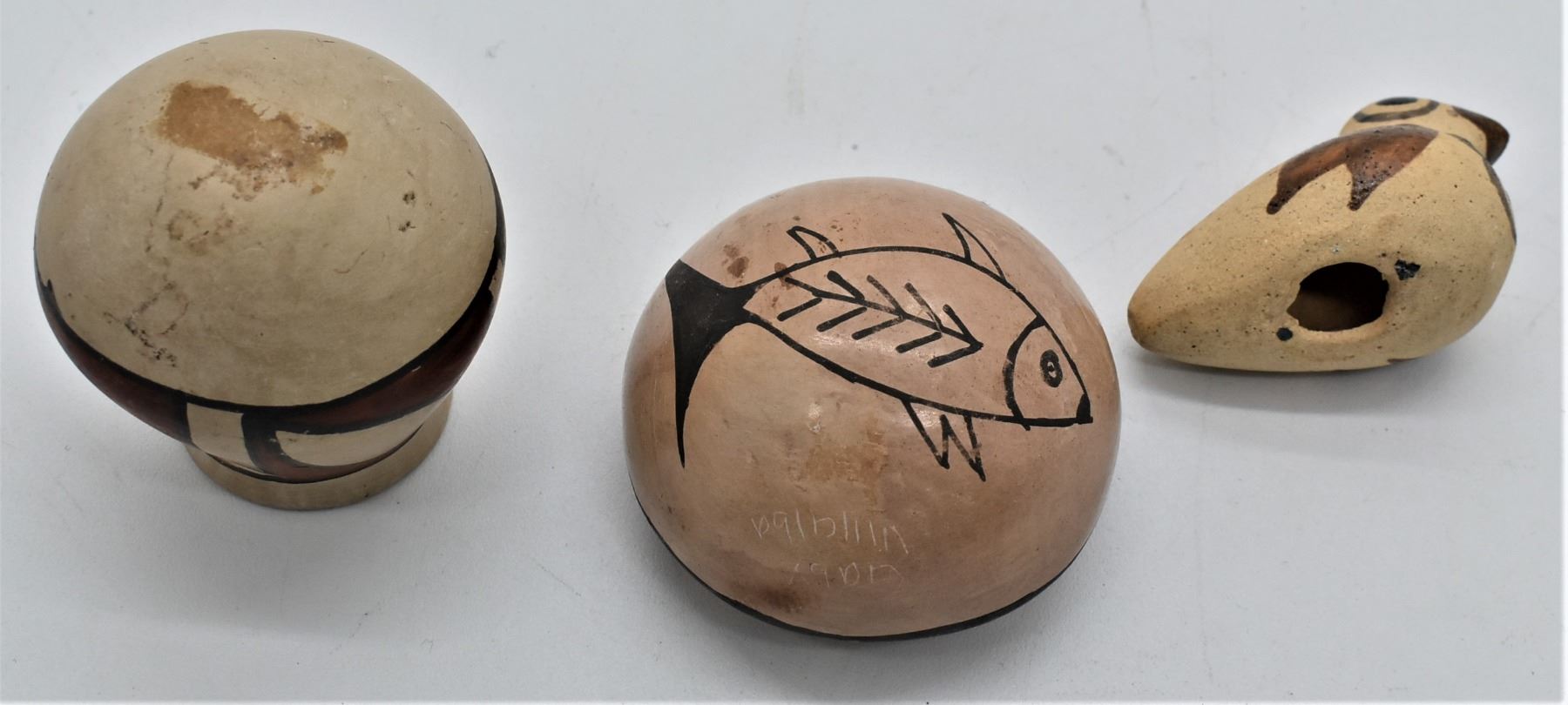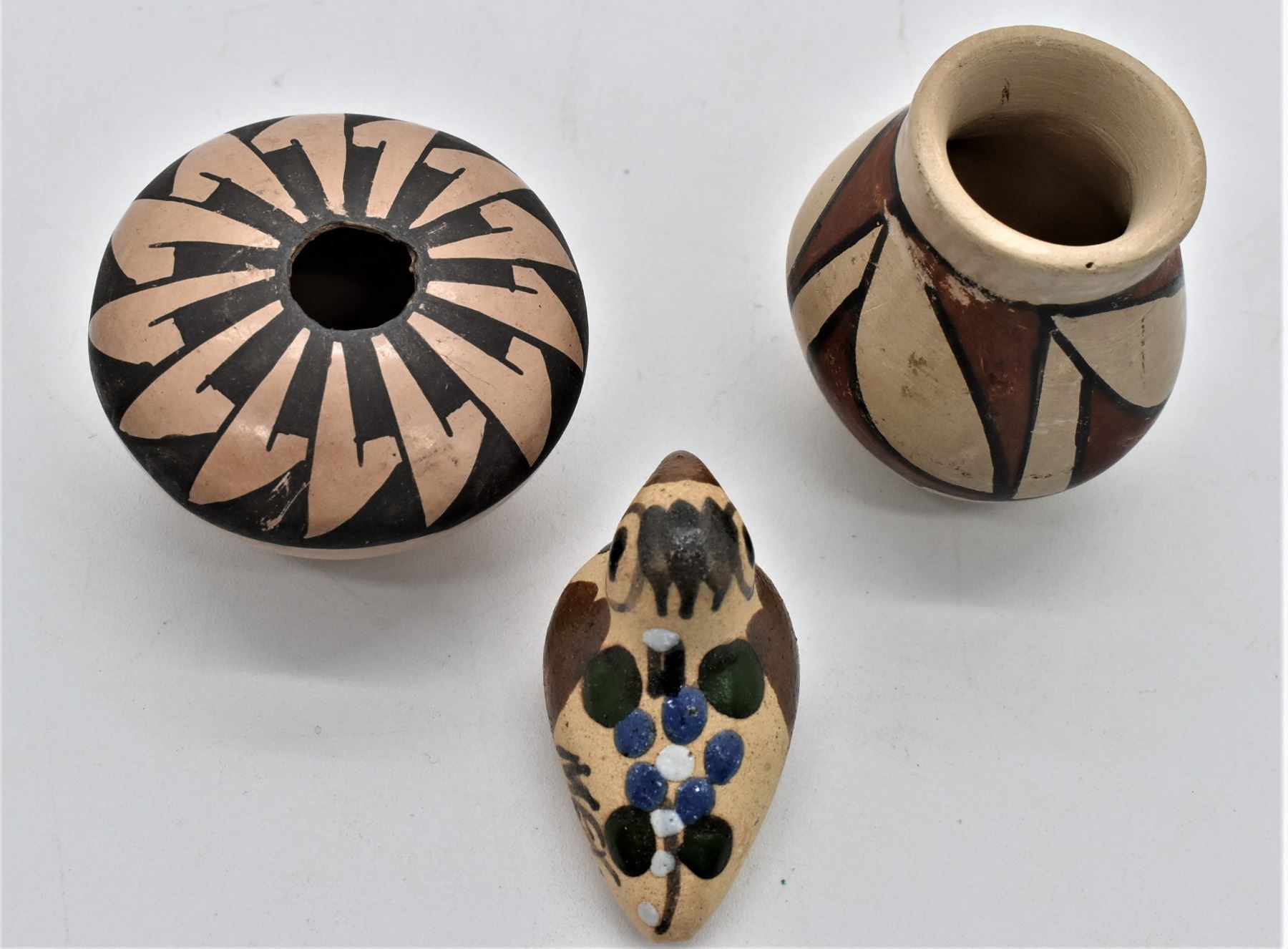Mata Ortiz Miniature Pottery, largest measures 1.5'' x .5'', feather pot by Gaby Villalba (signed)