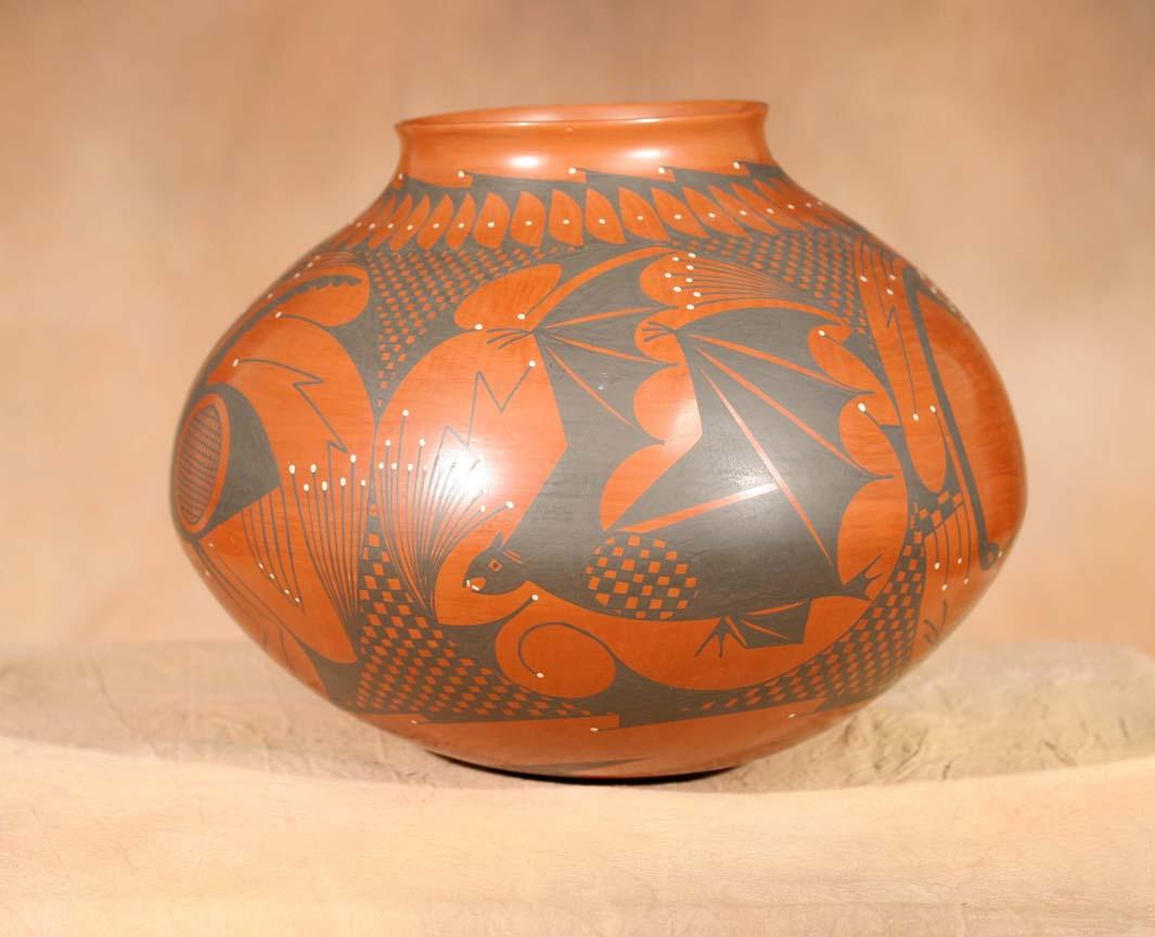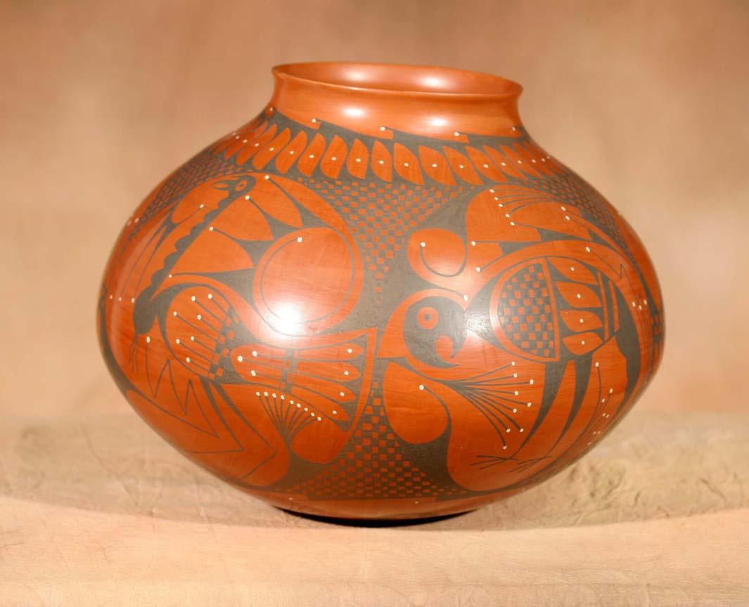 Mata Ortiz Olla. 10" x 12". By master potter Lucy Mora Di Bugarini. Black on brown design. Circa 1990s. (est $700-1,000). For condition reports please visit: www.auctioninsantafe.com/cr2011.pdf