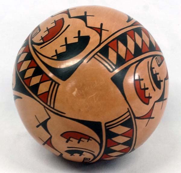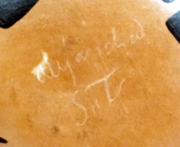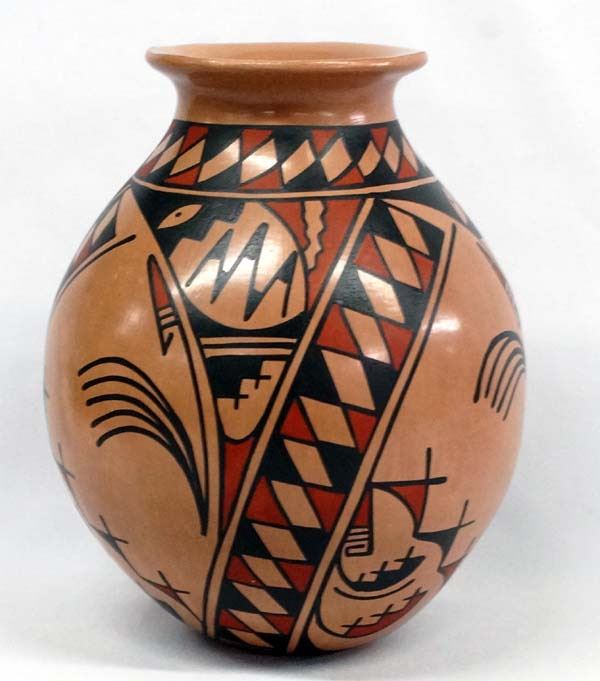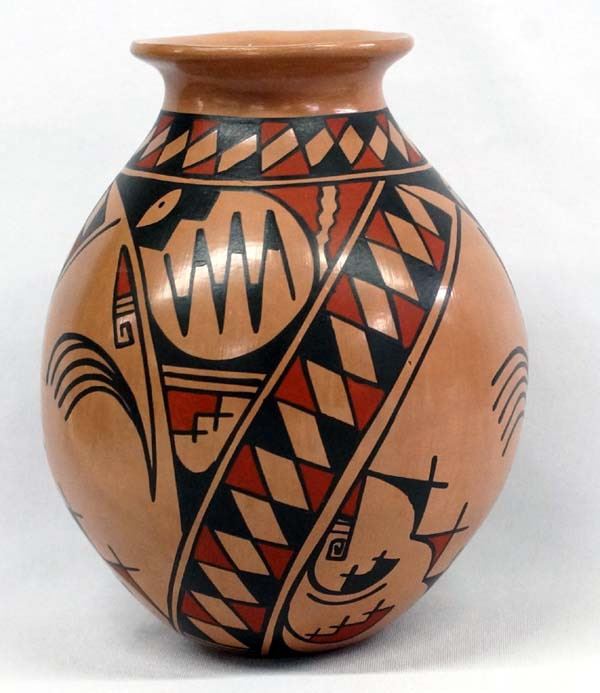 Mata Ortiz Olla by Alejandro Soto. Signed on the bottom by the artist, this piece has a Polychrome geometric design. It measures 7.25''T x 7''W.