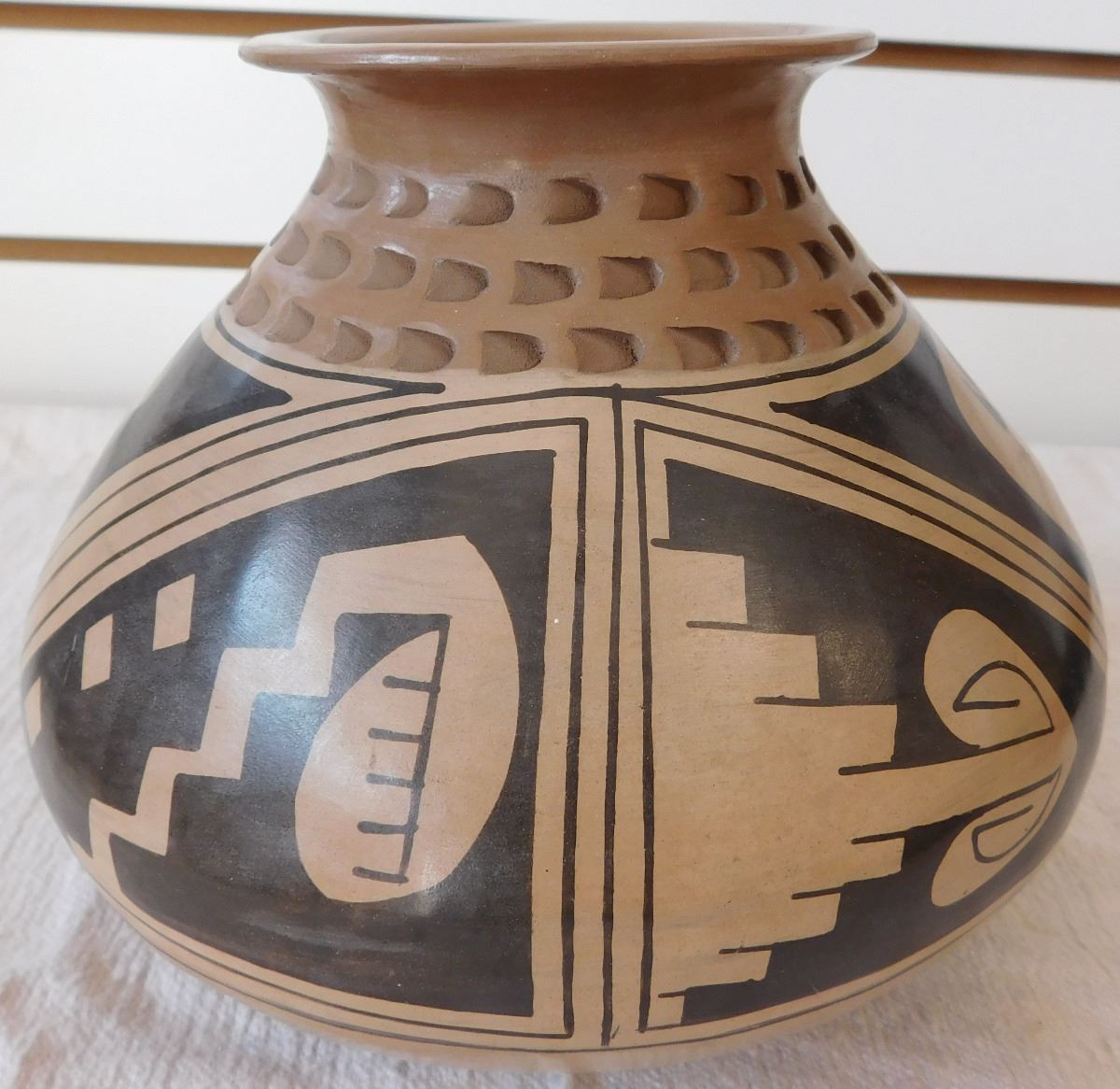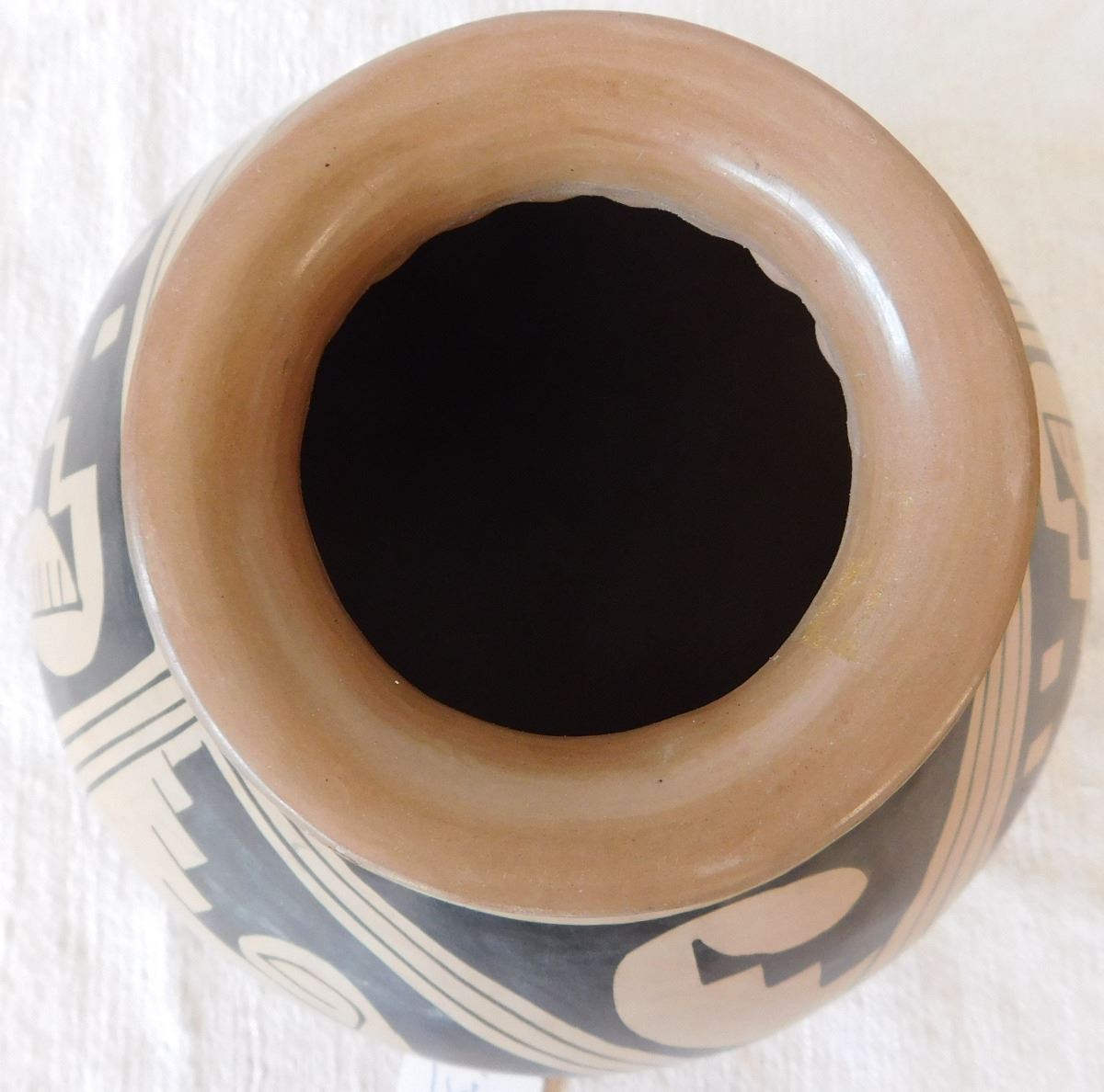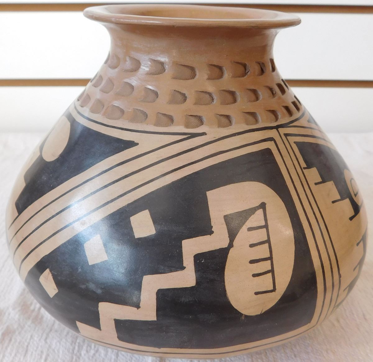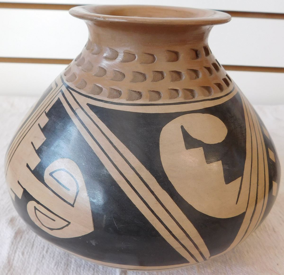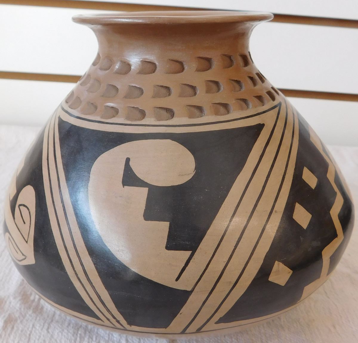 Mata Ortiz Olla, circa 1990s. Made of clay and paint, this item measures 7" x 6". Rio Grande. Signed Socorra Sandoval. Condition: Good, see images. Shipping: $24.00, requires double-box.