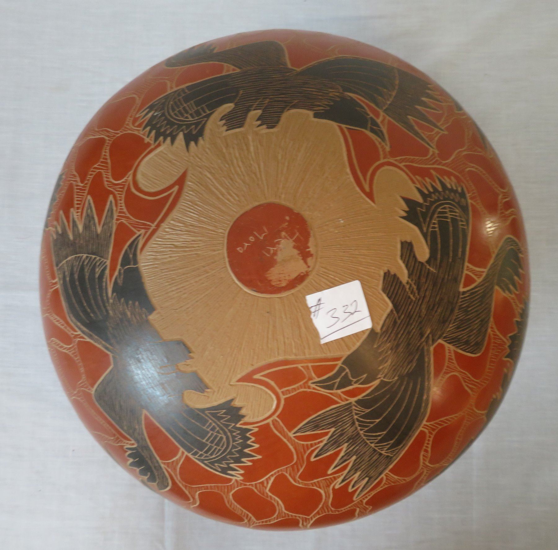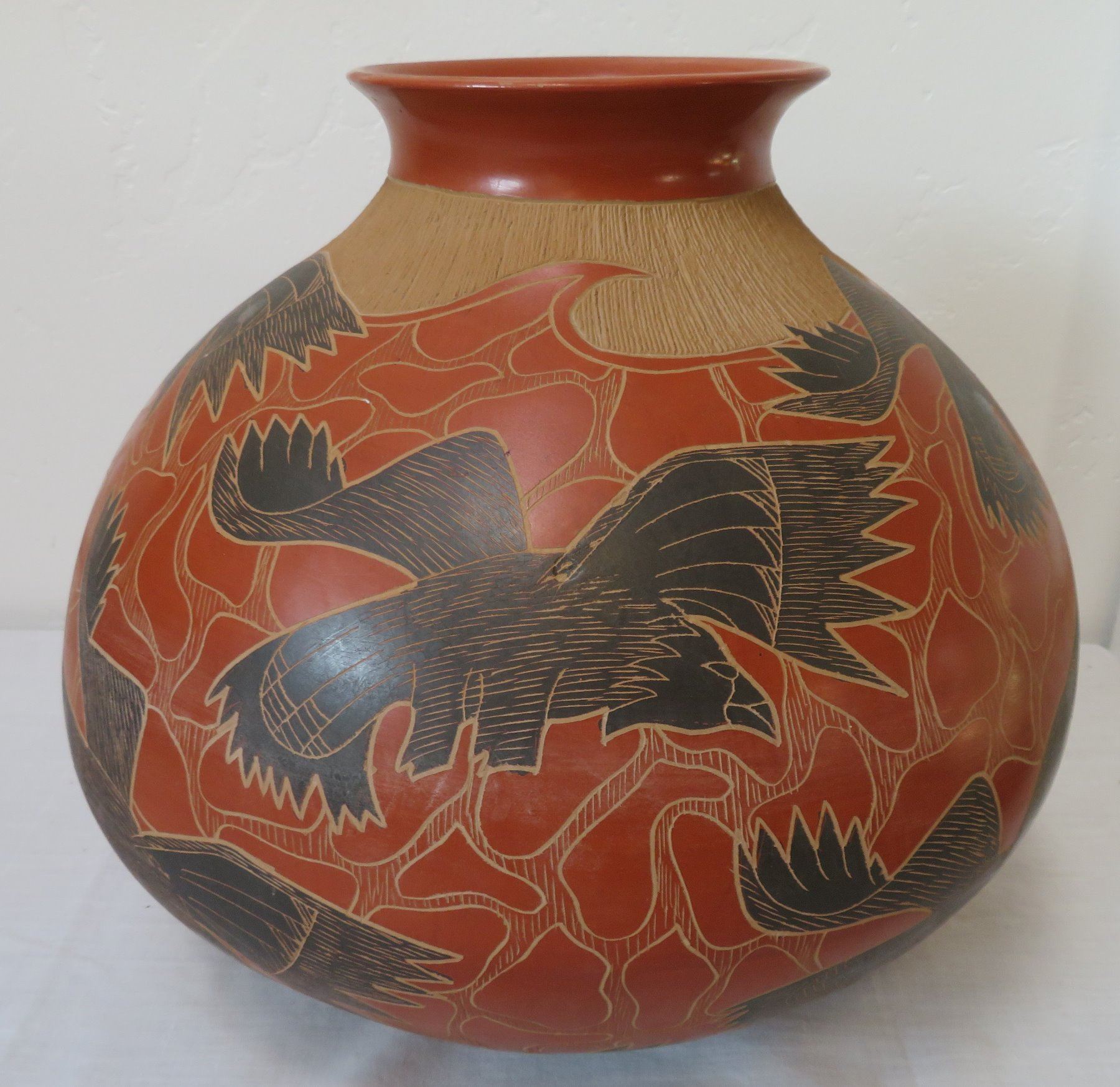 Mata Ortiz Olla, c. 1940s. Made of clay and paint, the item measures 12" x 12". Texas-Mexico border. Very fancy ealge design, polychrome olla with carving. Condition: Nice, see images. Shipping: $55.00 USA estimate only, w/insurance and signature, due to value and size, double-boxed.