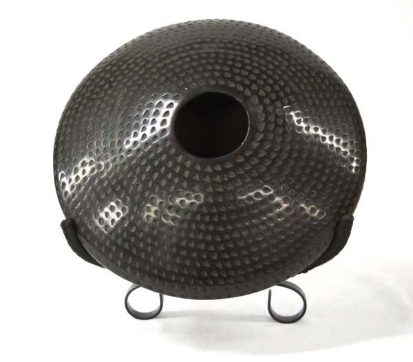 Mexican Mata Ortiz Pillow Pot by Luis Ortiz with Stand, measures 6''H x 12.5''D, signed by artist, highly textured