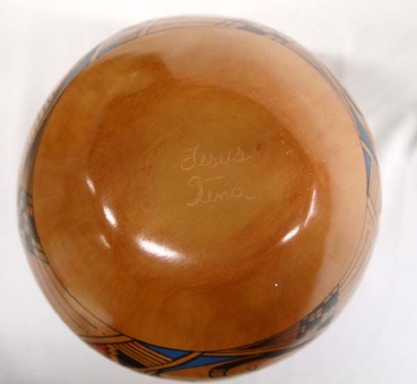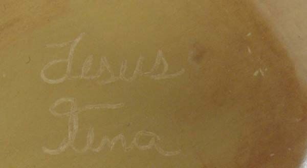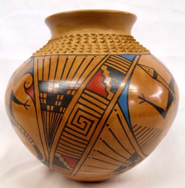 Mata Ortiz Poly Chrome Lizard Jar - Jesus Tena. Tall, Casas Grande style jar with thumb-nail indented design around rim and large lizards on the four sides. Black, red and blue designs on tan. Signed on the bottom, Jesus Tena. Measures 8.25''H x 8.5''D.