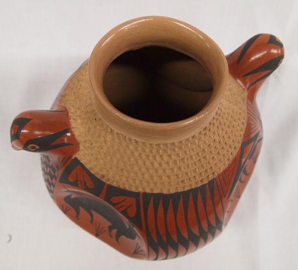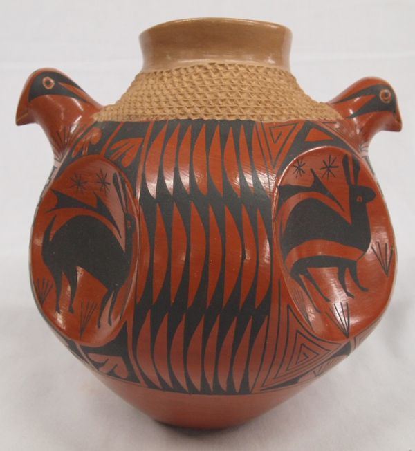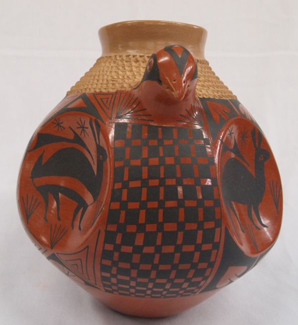 Mata Ortiz Polychrome Bird Effigy Olla with Rabbit Medallions - Jose' Gonzalez, features 2 eye dazzler panels and 2 crescent moon panels, 2 masked bird head handles, there are also 4 concave rabbit medallions, sgraffito signature on bottom of jar, exquisite jar
